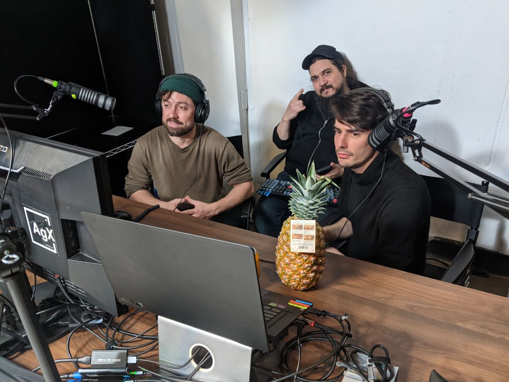 Round 3's stream hosts, AgX's Mike, Brooklyn Rats Adrian & George, Customary Tournament Pineapple Credit:HappyRaccoon