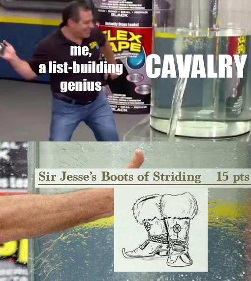 Not only do Sir Jesse's Boots' timely negation of difficult terrain make your charges that much more reliable, but it does so for a low, low cost in points. Yee-doggy!