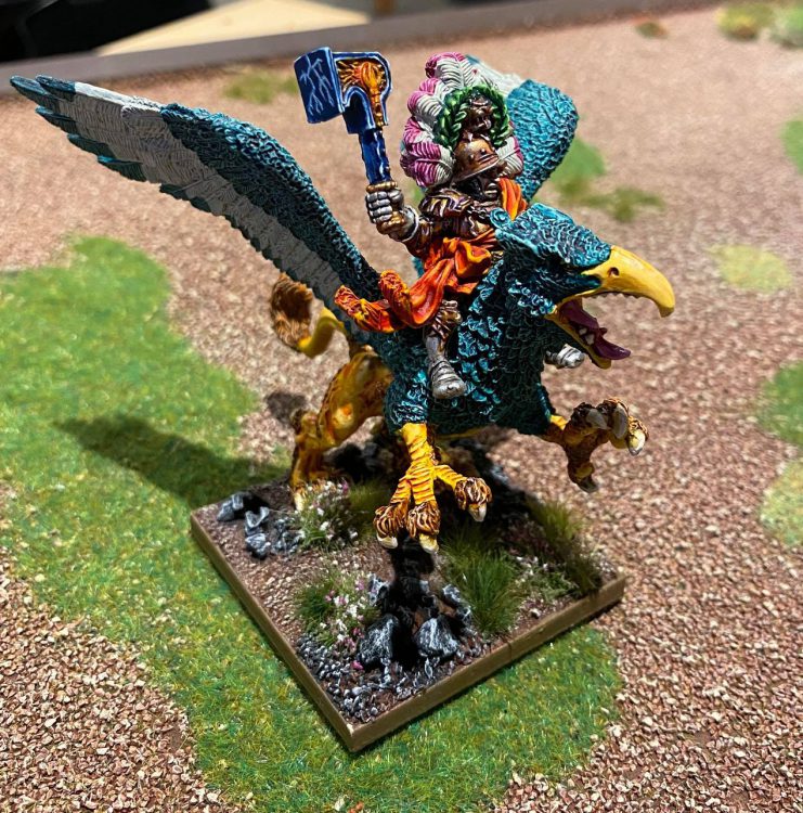 A General on foot or on horseback would suffice for simply this purpose, but putting him on a Winged Beast means he can quickly move across the army to where he is needed. The Winged Beast is also considerable in combat (Me 3+, At 7, Crushing Strength 2, Thunderous Charge 1), so it’s also important to be aware of any potential flank charges that might appear. He is best sitting behind or between units within his Very Inspiring range, and waiting for a good charge.