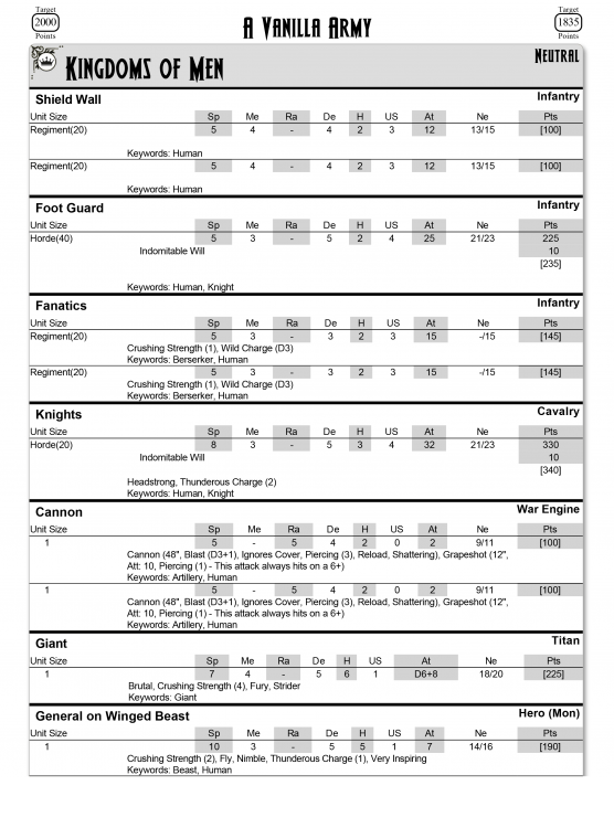 The army lists and unit profiles presented below were obtained from Mantic’s own list editor, EasyArmy. This is free to use, although the ability to save multiple army lists requires a subscription (which we heartily endorse). The actual printed rules for the Kingdoms of Men are available in the Uncharted Empires supplement book.