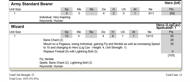 Here, we’ve swapped Fireball for Lightning Bolt (Piercing 1 and extra range) and added Bane Chant to add extra Crushing Strength where it's needed. Adding a Pegasus also gives extra height, to make sure we can target what we want, and more importantly, gives them Fly and Unit Strength 1, allowing the Wizard to grab objectives for us later in a game.