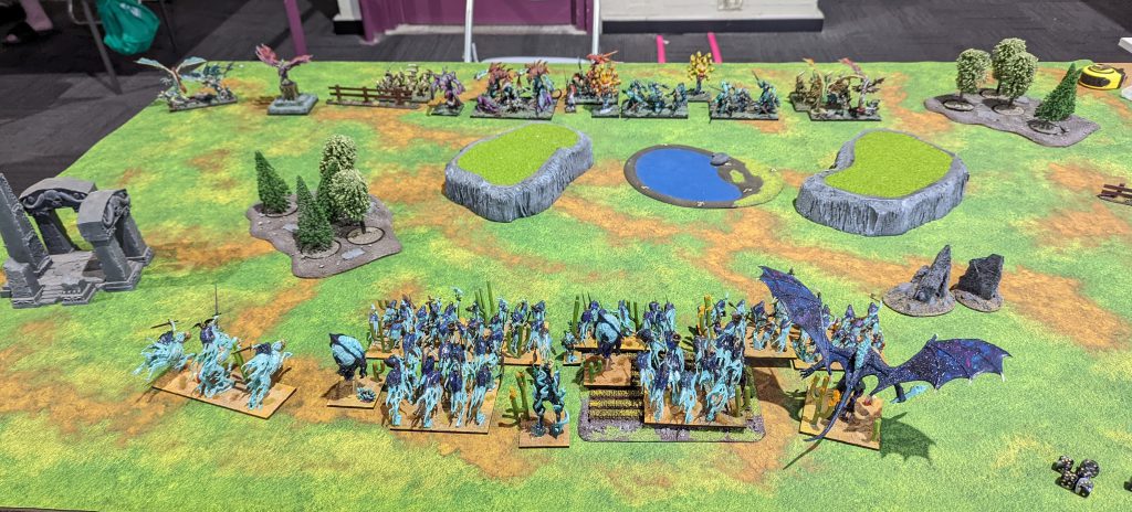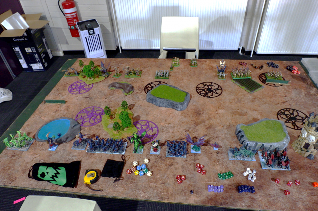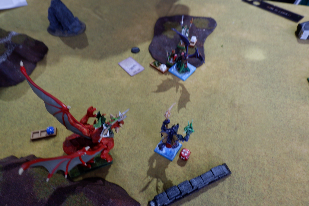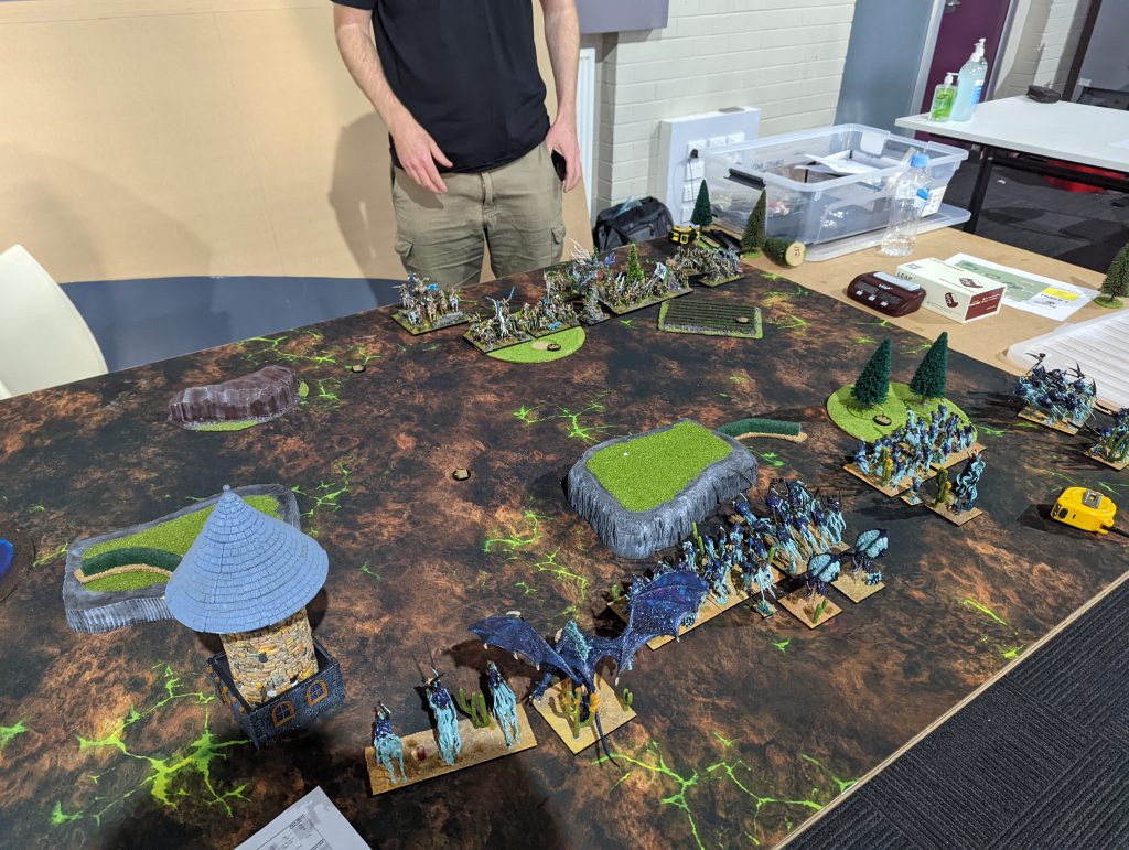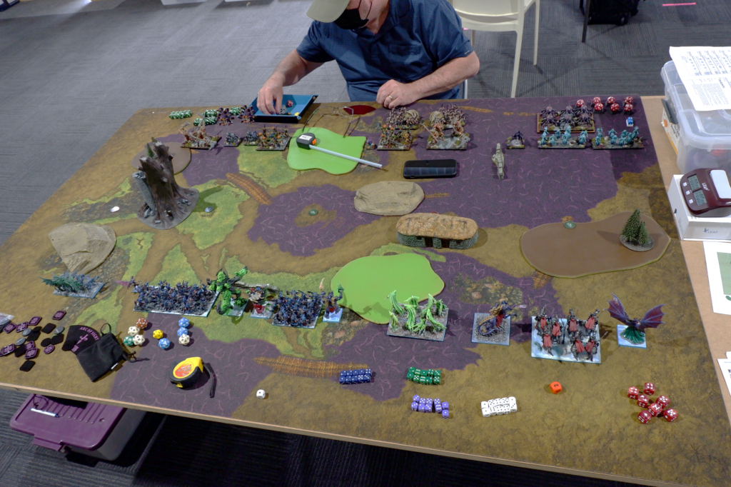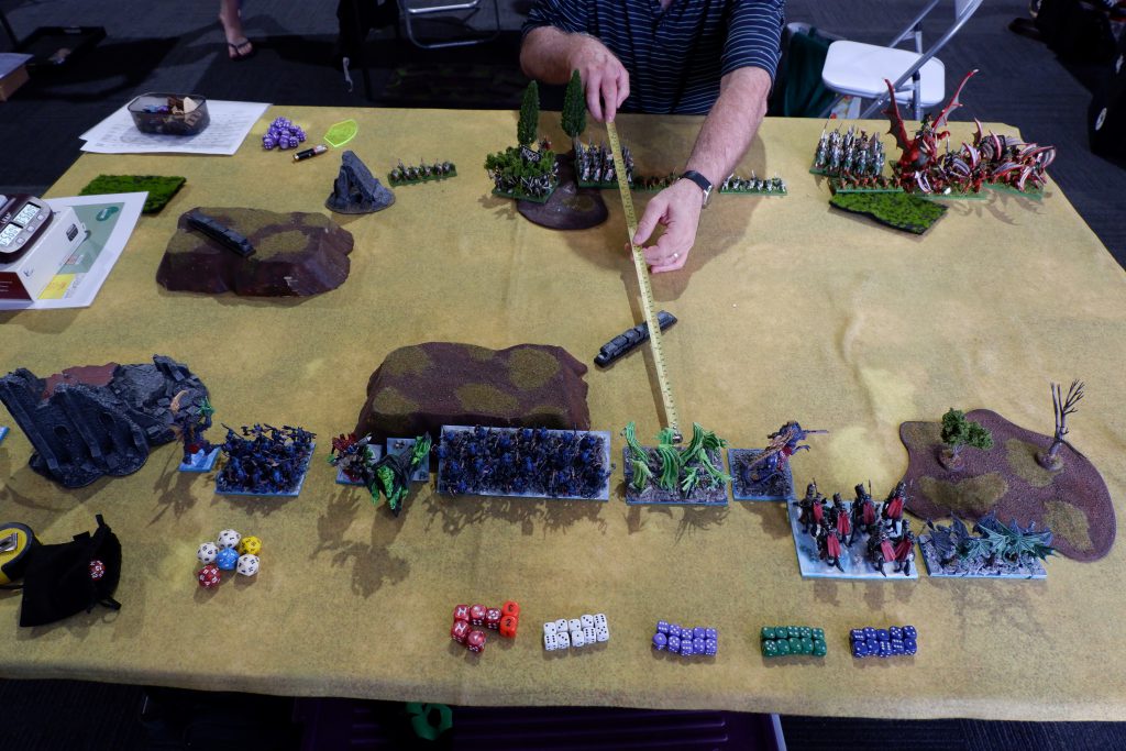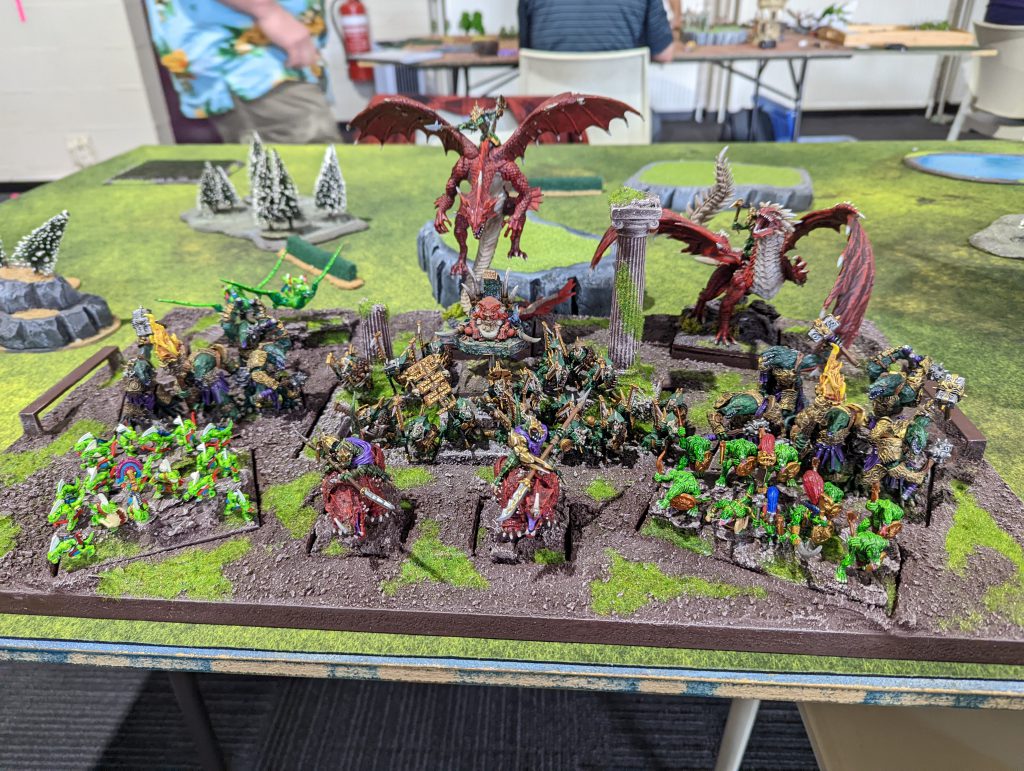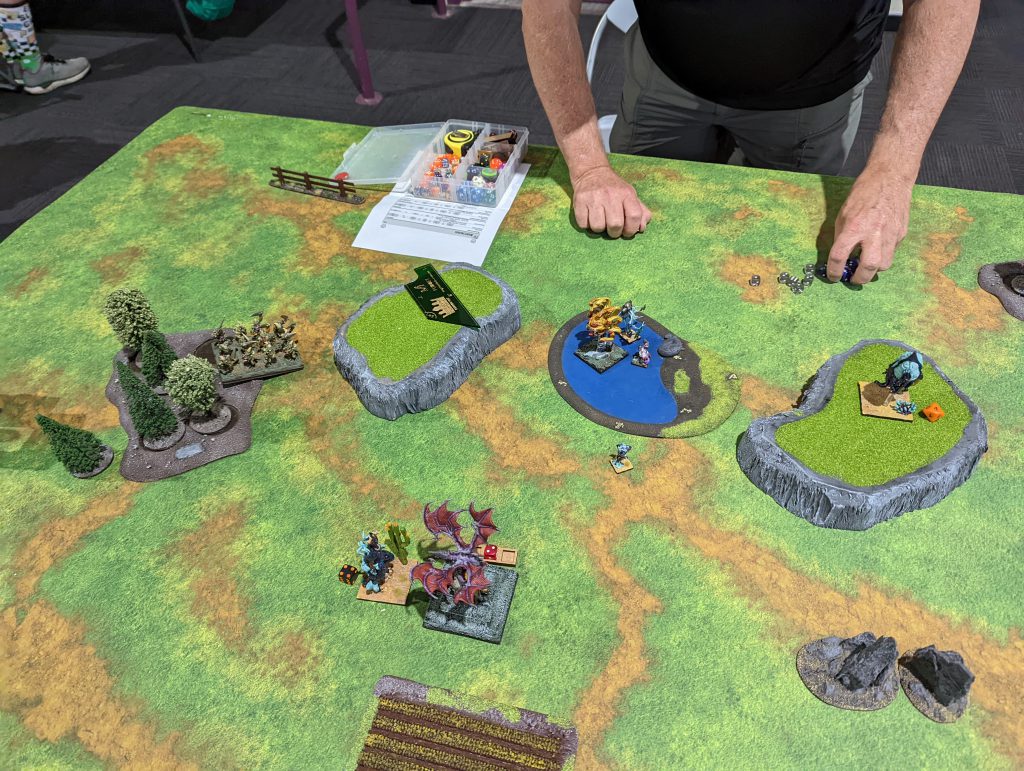 First off, there’s no photos of this game. Rob and I started chatting right from the start of the round and so I just forgot. It turns out Rob had been to the last Melbourne event and we had had a brief chat then. Rob was a long time Warhammer Fantasy player but had recently started in Kings of War, and you can see in the pic below a very well painted army with a mix of old Games Workshop Lizardmen, Mantic Salamanders and dragons from a manufacturer I don’t know.