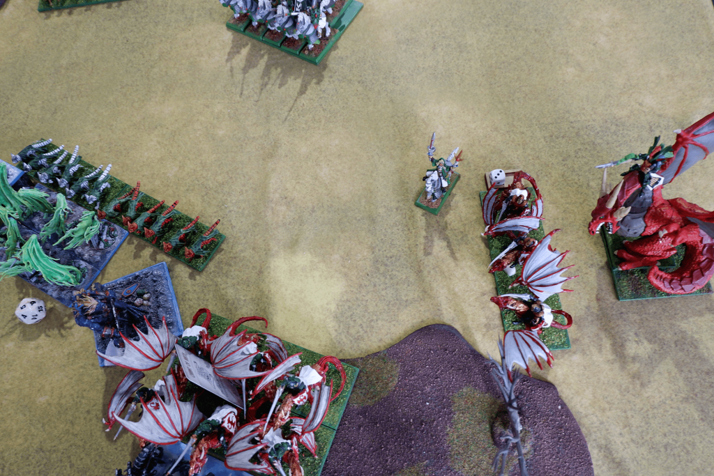 The first turn of the game was uneventful; shooting was ineffective for both sides, and the drakons moved up relatively tentatively. The Abyssal Champion, in an act of impatience, charged the Drakon regiment. Despite successfully disordering the Drakons, the Abyssal Champion was then multicharged by Tydarion and the Drakons, which pivoted to face the flank of my entire army upon the Champion’s assured demise. This was not a good use of the Champion.