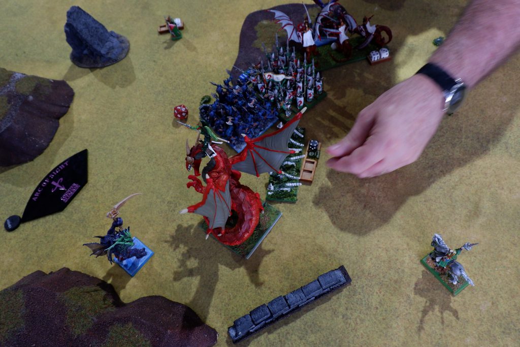 The Stormwind Cavalry attempted the same feat against the Abyssal Fiend, but pulled up short on the nerve test. The consequence of this was that the Stormwind Cavalry were ripe for a flanking attack by the Tortured Souls. Despite this minor victory, the Tortured Souls and Abyssal Fiend served only as a roadblock for the Drakons and the Dragonlord, safeguarding the rest of the army until Turn 5.