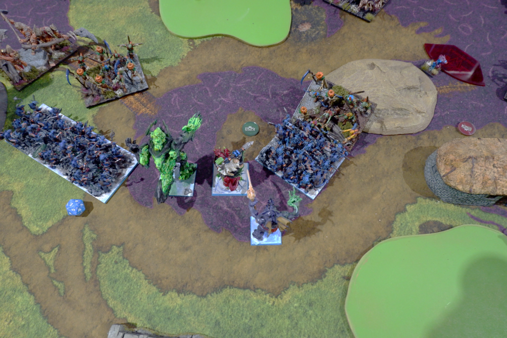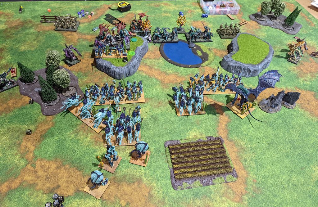 The Scarecrows and Void Lurker follow up, the Lurker killing one unit while the Scarecrows fail, but miraculously survive the swing back with the Boskwraiths in the flank as well. This mostly seals the game, with the Wiltfather killing Esenyshra in one go, but then going down to Reapers soon after, and while the Stormwind Cavalry had moved to take an objective, I move up and Wind Blast them off, taking an extra point for me and leaving me up 4-0.