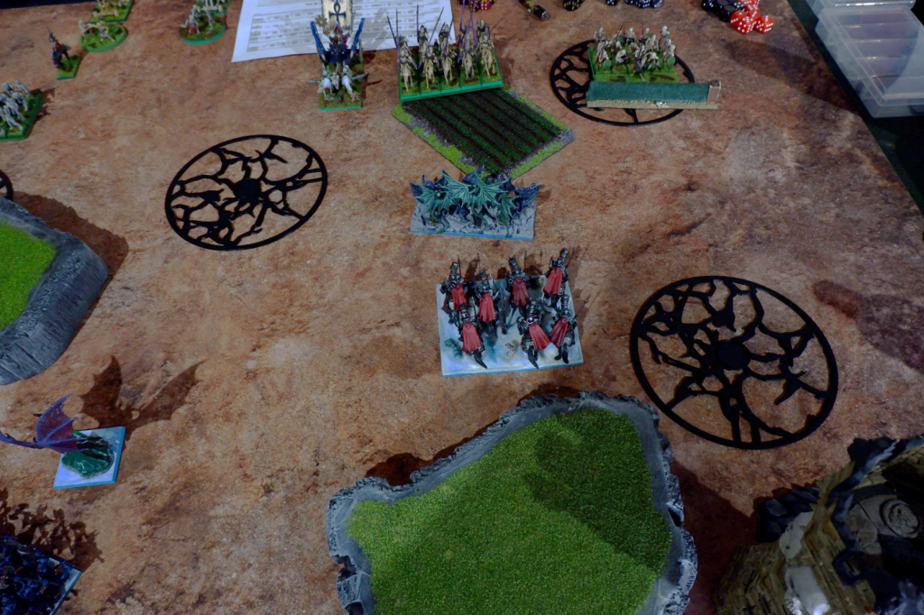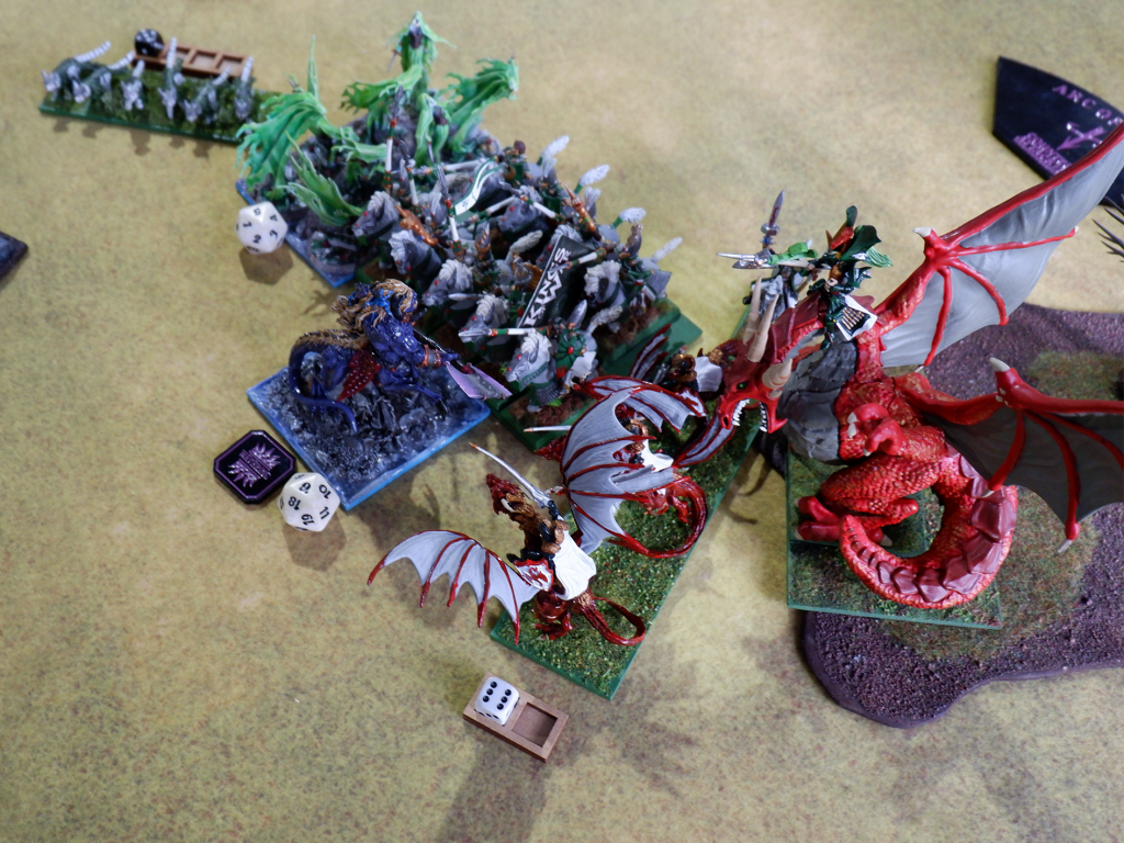 Why I deployed the Abyssal Horsemen (the ultimate hammer of my army), not in the forest, I do not know. Was I afraid of being hindered by the terrain? Probably. But this then provided John the entire flank, which his drakons and dragon were happy to use. As a band-aid for this awkward situation, I had placed my winged Abyssal Champion on the far right flank (not shown).