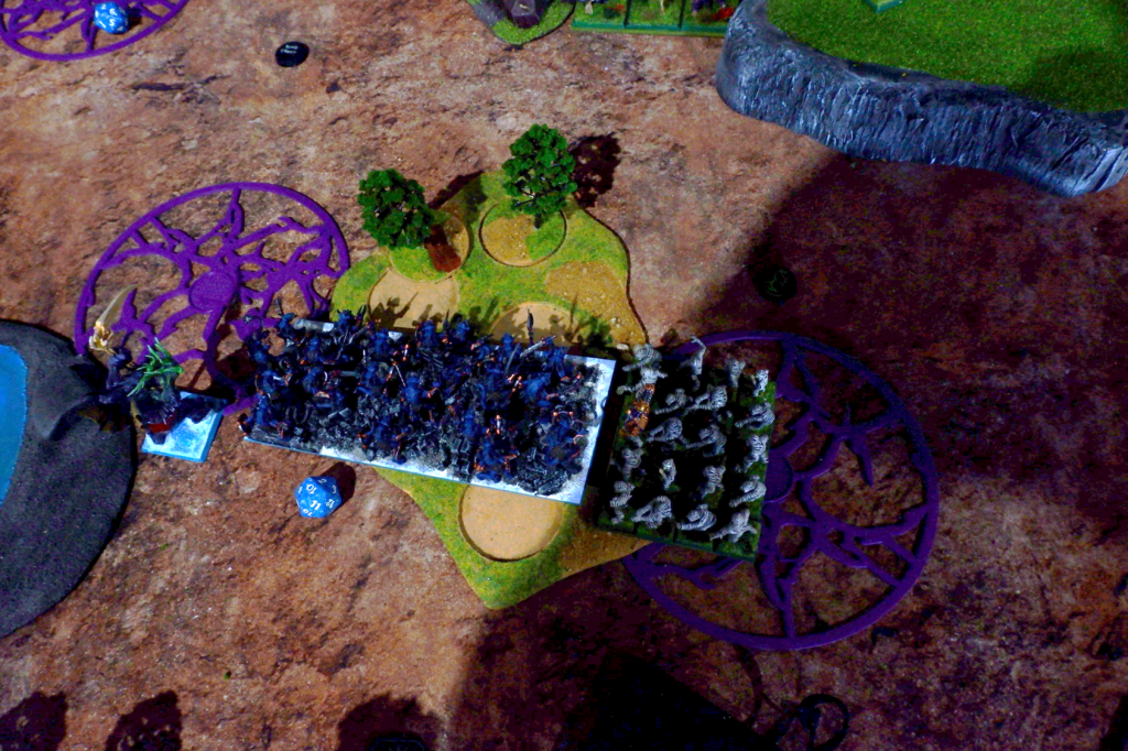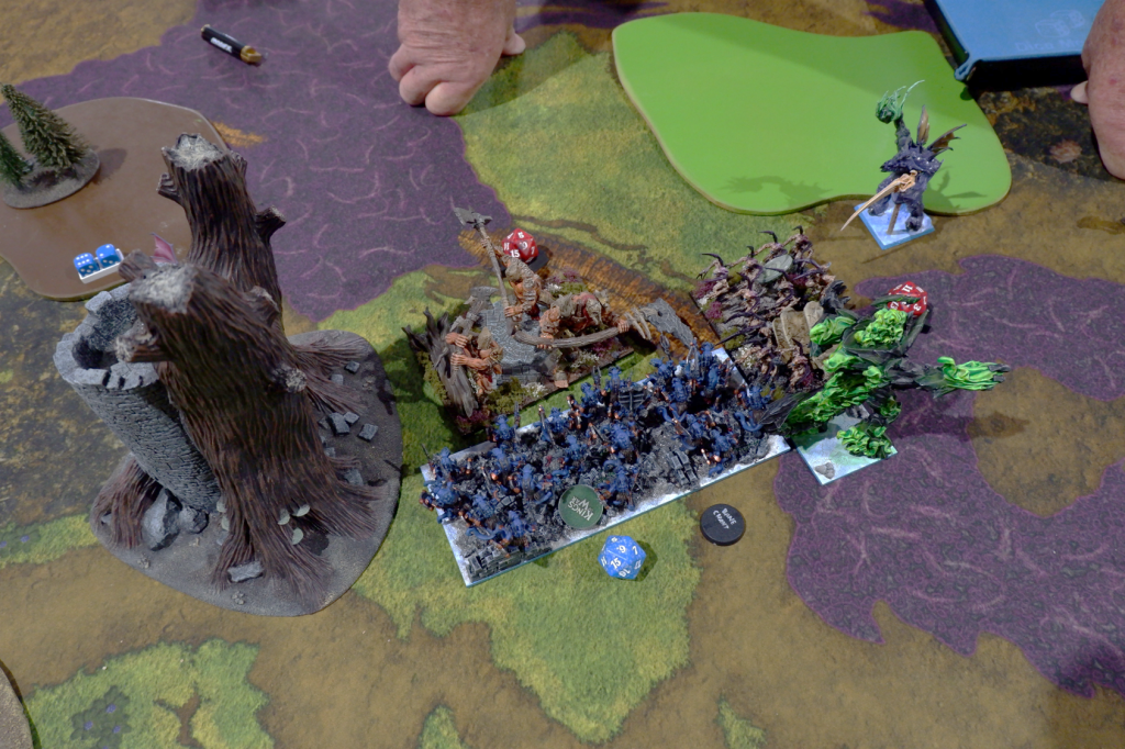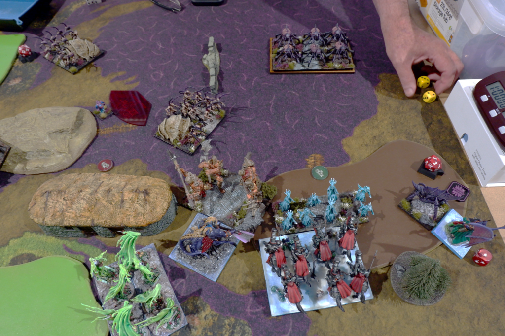 The first two turns see Dan’s army getting into position around the terrain and shooting, while I move up and lightning bolt, and try to heal the chip damage from said shooting.