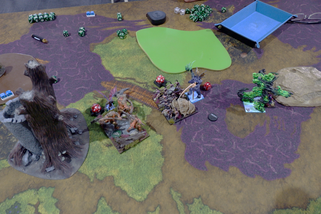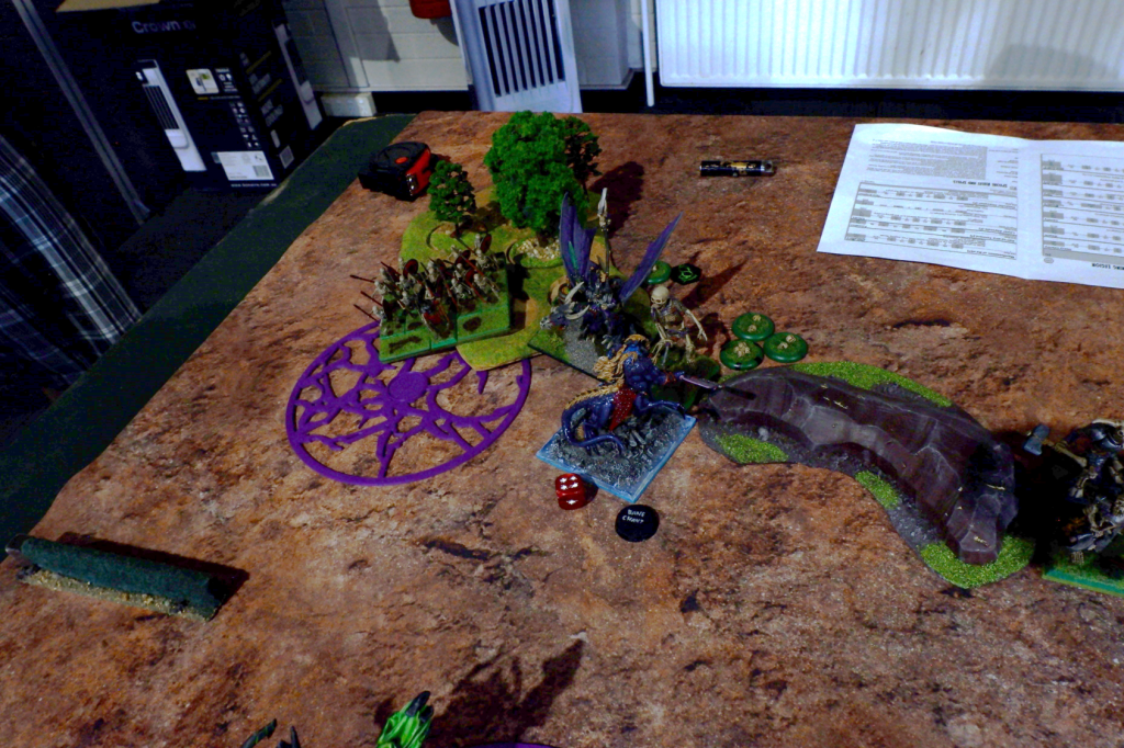 For game three I was up against Daniel Bird. Now Dan is the guy who introduced us both to Kings of War, so we were staying up with him and his team (Team Shed). Dan and I played a practice game the night before, and it did not go well for the Sylvan Kin, even with some poor rolls from me. Unfortunately for Dan, Nightstalkers are a counter to the Gladestalker shooting list Dan is running, and my Nightstalkers are fast enough to not give what shooting there is time to work. So going in I was pretty confident, I just had to make sure I was playing for objectives, not just killing.