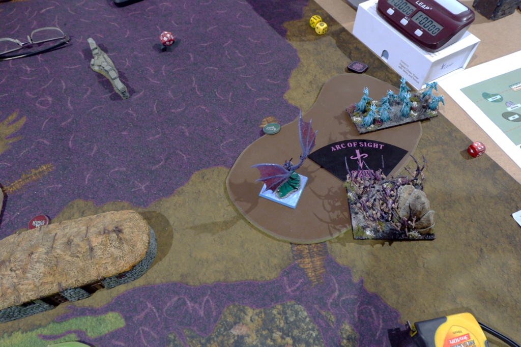 At the same time, my Chroneas was engaged with the Horror, who failed to wound the Chroneas in return. Within 12” of my Chroneas, directly in front, was a 2 Victory Point token (the one behind the hut). My Chroneas ignored the Horror and claimed the token for a victory.
