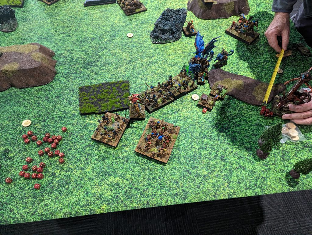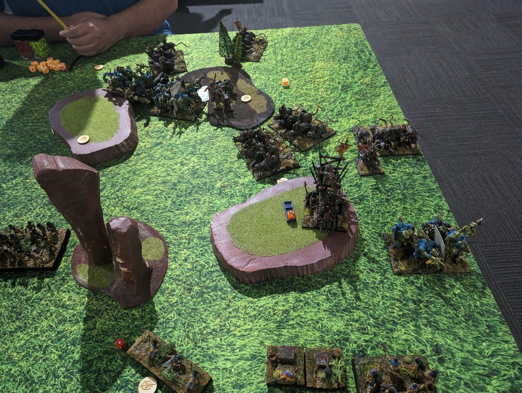 I had spread out across my whole deployment zone, while Clint crammed everything in one third of the board on my right. I had vaguely counter deployed, but not with enough to beat the oncoming hordes. I thought I would lose that side pretty quickly, without the ability to change position fast enough. I did know I can secure 3 points worth of tokens, but misplacing a one point objective on the hill right in front of Clint’s Troll hordes means I’ll be struggling to claim that back. Also, with the way he deployed, it’s pretty obvious where his tokens were, meaning I know I'm on the back foot from the get go. But let’s see if I could get some luck and bring it back.
