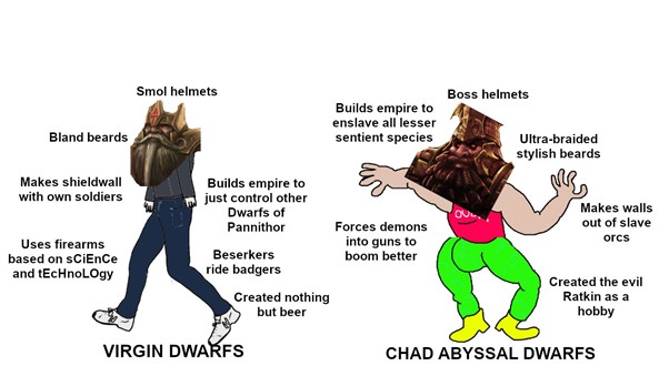 If the Dwarfs are the Chads then the Abyssal Dwarfs are the Goth Chads that somehow managed to out-Dwarf the Dwarfs. If you just enjoy being simultaneously the toughest, shootiest and most annoying army in the land, then these guys are the army for you!
