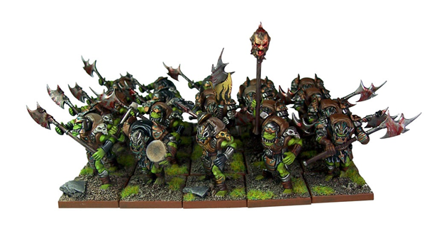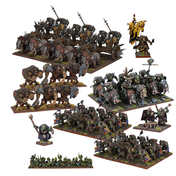 In Kings of War the Orcs are a blend of the inherently evil Tolkein Orcs and the destructive and brawny Warhammer Fantasy Orcs. This means that although they seek to destroy all by smashing it multiple times in the face, they have the capacity to go about it in a bit more of a tactical way. They also don’t go about it alone, and attract all manner of creatures that relish the fighting as much as they do; trolls, giants and giant boars (called gores) add even more crushing power.
