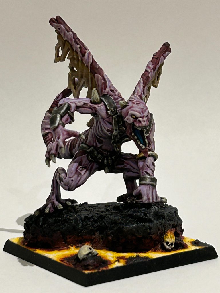 The Archfiend is the dragon of the Forces of the Abyss; it’s a huge flying combat monster. Compared to a typical dragon, it’s not bad. Fury means it will keep fighting when Wavered and the Regeneration (5+) upgrade provides the ability to somewhat shrug off shooting in the early game. And they need it; like all dragons at Height 6 they’re easy targets for everything with a bow, gun or catapult. The Archfiend’s favourite place to start the game is behind or in cover, and when coupled with Regeneration (5+) they should be able to weather a considerable amount of firepower.