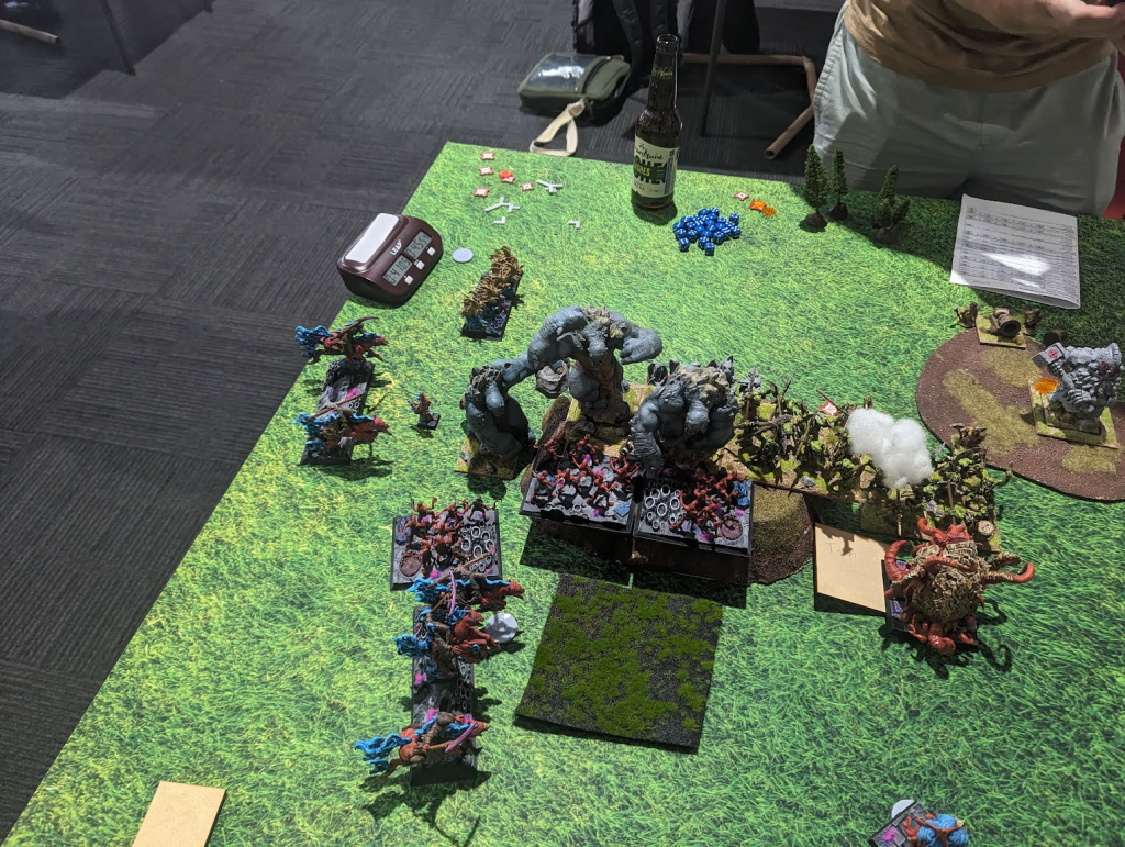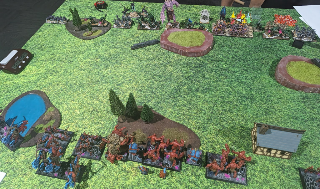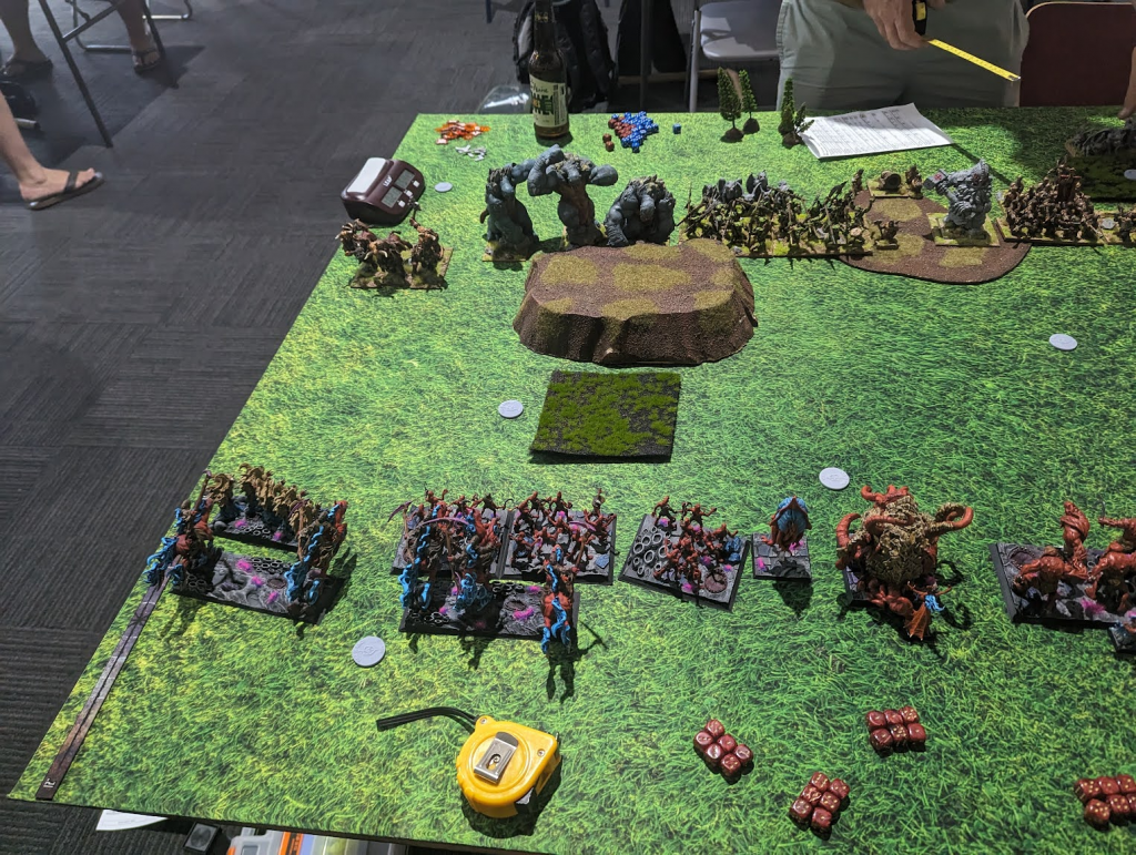 Ok, Game 2 and against Abyssal Dwarfs no less. There were a few Abyssal Dwarfs players this year since they got some very nice buffs in the latest Clash of Kings update (sidenote: we need to stop calling everything Clash of Kings!). Luke’s list here is the least reliant on shooting, which is a mixed bag. He hasn’t put as many points into it as other players, so there’s less “wasted” points vs my army’s innate Stealthy, but at the same time, the more dice you roll, the greater your chance of getting something though. I’m not worried about one Rocket Launcher, or the troop of Decimators. On the other hand, the Halfbreeds and Grotesques are very scary.