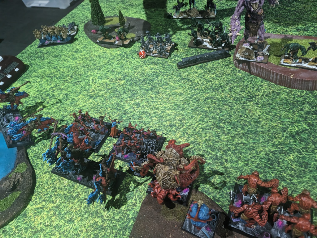 As for Invade, I’ve definitely got the advantage. I’ve got a lot of fast flyinging units, and Wind Blast and Enthrall are great scenario tools, even when they’re not used to keep things in/out of the kill box. We both deploy wide across most of the board. Lindsay has a nice blocking piece of terrain on my right flank. I’ve got an annoying one on that side as well, but closer to the middle.