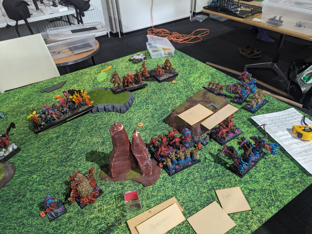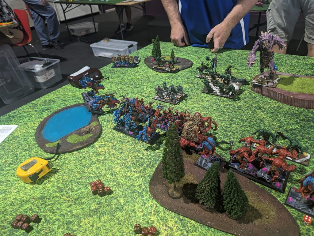 The big play doesn’t get him there, so it’s a solid win to me, though a bloody game. I’ve only got one Ravager horde, one Soulflayer, one Phantom plus the characters left, and crucially, all the unit strength has crossed the invade line. It was a fun game, and a pleasure to play Lindsay, so a great start to the day. This is the first time I’ve actually won my game one at Clash, so no submarining this time!