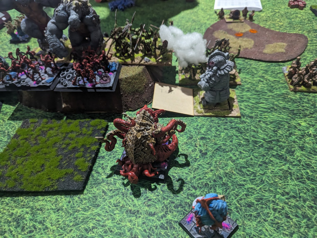 Luckily, the Terror survives, and is ready to kill again. On the right, the Berserkers pick up the Phantoms, but the Soul Flayers just keep hopping around and threatening flanks and rears, and keeping the evil Dwarfs on their toes. The Terror gets double 1s3 on the Orcs, and is killed by the Golem in the following turn. The Soulflayers and Esenyshra on the left pick up the Grotesques, and then double 1s the Grotesque Champion on the following turn, as the Gargoyles get a rear charge on tho the Soulflayers. They live, and sacrifice themselves to the Dwarf’s Fireball after finishing off the Orcs. The Gargoyles also get double 1s in the same turn as the Champion, but it doesn’t really matter. I’ve overwhelmingly won that side, and there’s 4 points worth of tokens there.