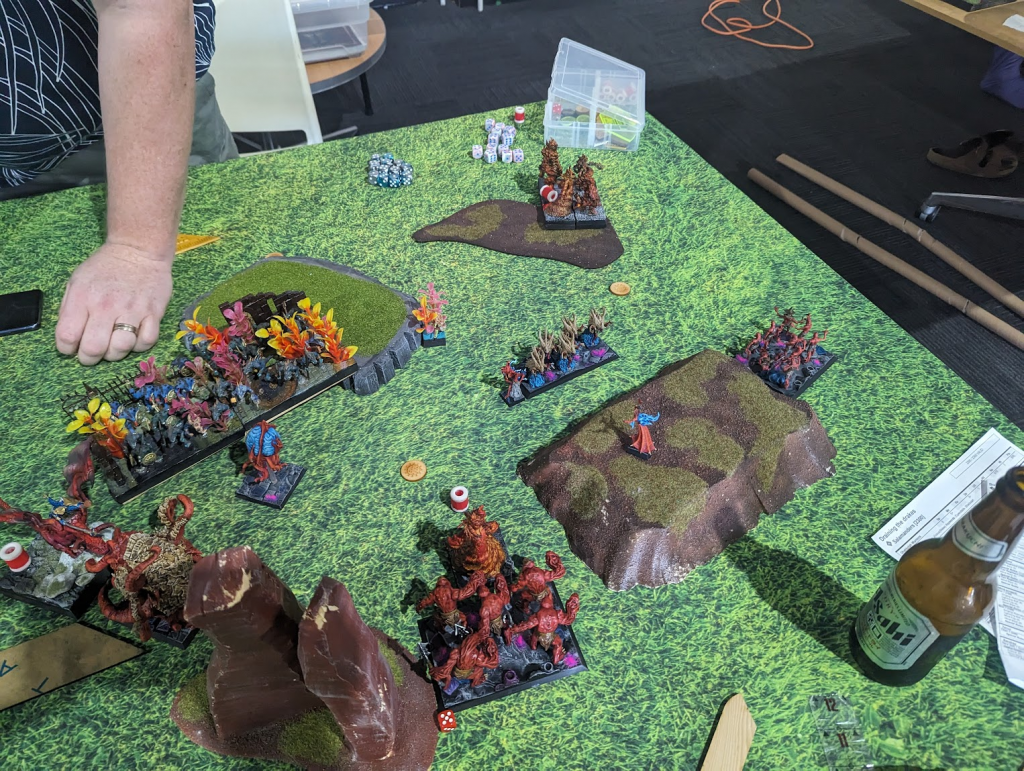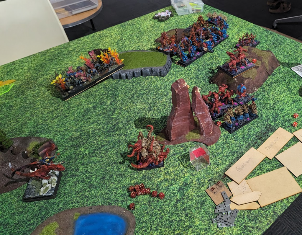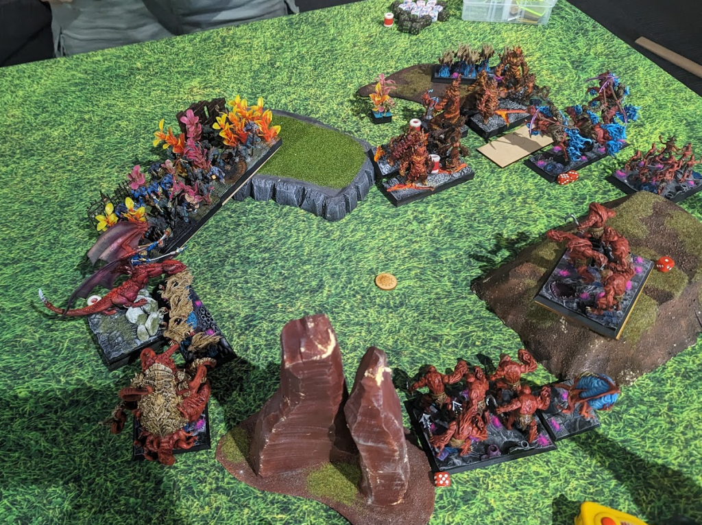 Ah, so this was a bit of an annoying loss for me. Esenyshra flubbing her combat against the Greater Fire Elemental just put me in a spiral. This army is very fragile once it gets hit by anything with Crushing Strength, especially if it has Vicious, too. Damo played it very well though, and was ready to dominate on the left, so I would have had to grab the three right tokens for the win anyway, so there’s no guarantee he wouldn’t have won anyway.