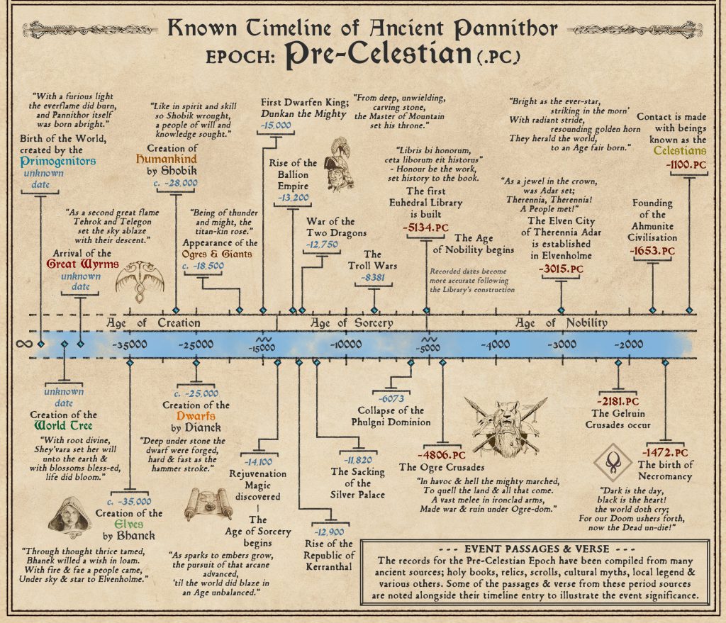 The first formal timeline of events in Pannithor prior to the Celestians. Published in the Kings of War 4th Edition Rulebook. Credit: Mantic Games