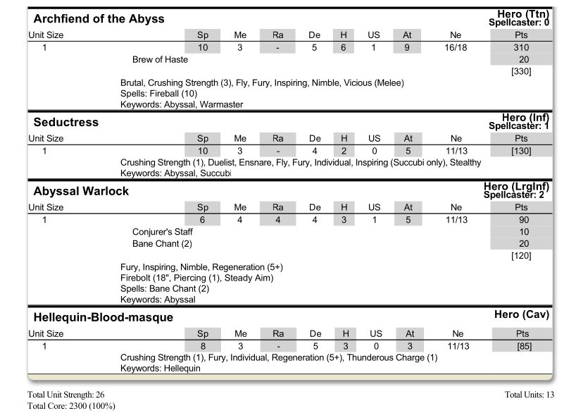 And lastly, the big boy himself, the Archfiend of the Abyss. A great unit once you know how to use him properly. He will die if he gets thrown into the front of an army, but because he has nimble and fly, he can be a huge pain just teasing the opponent, lobbing fireballs until an opportunity presents itself for a big flank charge.