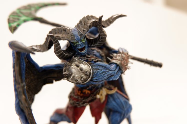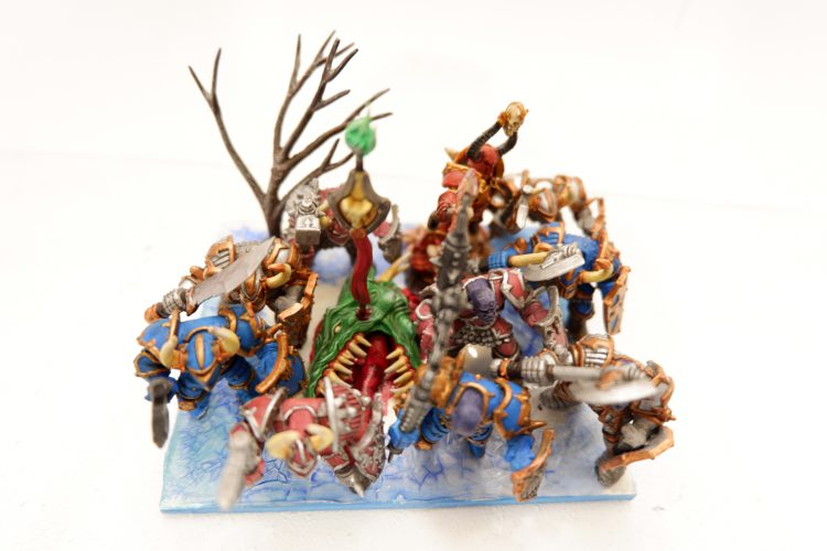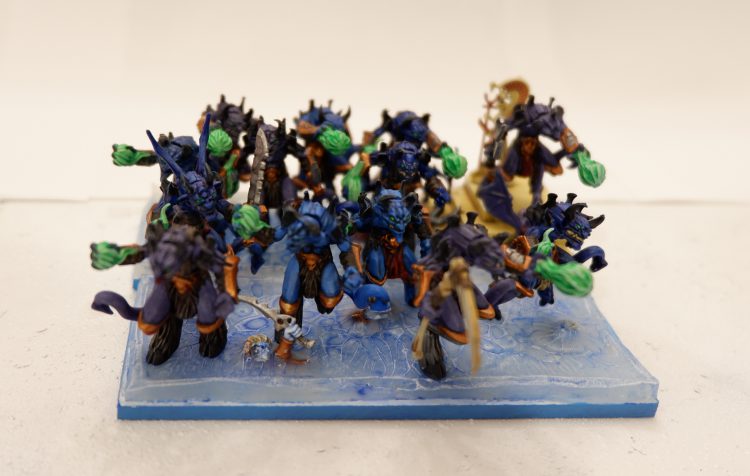 Cytoplasm: The Forces of the Abyss had attracted me right from the start of my time with Kings of War. I had collected Warriors of Chaos in Warhammer Fantasy, but I also liked the classic devil look that was present among many of the models of the Forces of the Abyss. My hope was to combine some of the brutal look of the Warriors of Chaos range with the almost cartoonish look of the Abyssals. This combination reminded me a lot of the art style of the demons in Warcraft 3 and World of Warcraft, so I lent heavily into this look and named my list ‘The Burning Legion’. As you’ll see in the pictures, I went for blue/purple skin tones like the Eredar (pre-corruption Draenei), and any flames were green like the flames of the Fel. This theme made the whole army, that was a mix of Games Workshop, Mantic, and other random minis, come together under a cohesive theme.