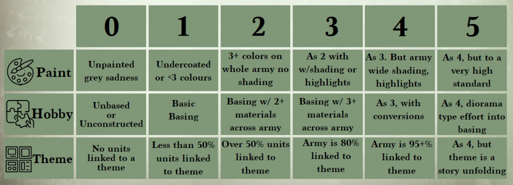 I am aiming for a high hobby score this time around, and would love to be in the top 5. This won’t be easy as there are some exceptional hobbyists around here. We’ll have to see who else comes, but I think I’ve got a good chance based on the rubric. While my painting is probably not at the “very high standard” needed, I’ll be aiming to hit 4’s or 5’s in the hobby and theme categories.