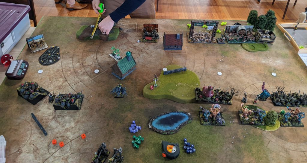 On Turn 3 I choose to engage the Zombies with my Rabble. Owing to the array of forces, my war engines had little they could target on this side so I chose to get in the first 'hit'. This hit was more of a pool noodle (Rabble, right?), but what I did manage to do was pickup tokens. Retaliation by Sellick removed one Rabble horde but the other lived, so next turn I dropped a token for my Troll Bruiser to pick up and wander off with. Then started the meat grinder as Trolls attempted to smash their way through all the Undead.