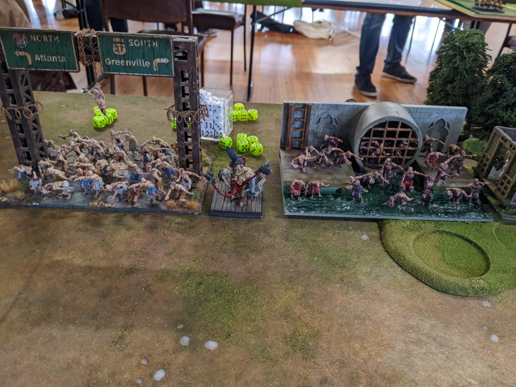 My army follows a standard deployment that I have honed. Facing off against all the zombies are my Rabble hordes (Wave 1), followed by Trolls (Wave 2), supported by all the requisite heroes. On the left, the Explodo’matic Bangstiks are set up. Big Rock Throwers sit in the middle, with Winggit and Groany Snark deployed also in the middle.