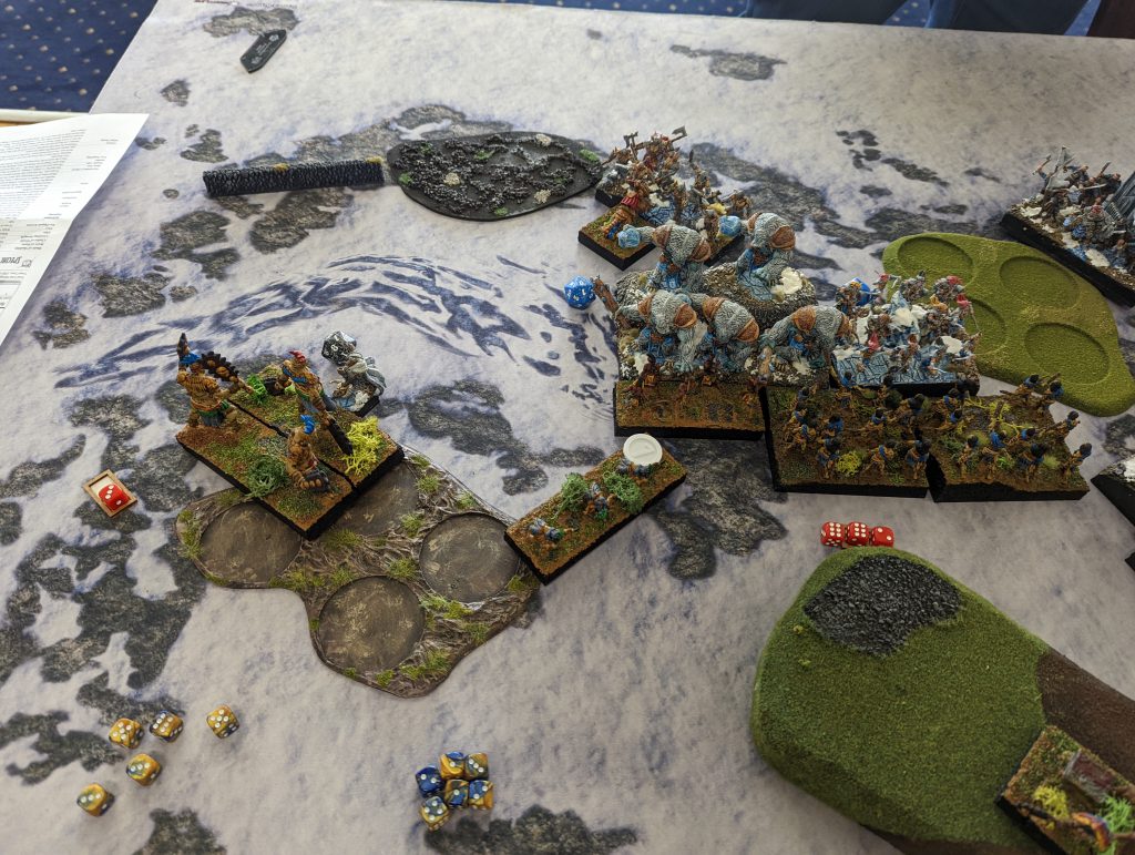 I know I have to hit back hard and shore up that weak point. The Lord on Foot goes to fight those Trolls, the Fallen whack the Winged Lord, the Frostfang Lord goes around the back to hit a Huscarl troop, while the Draugr counter the Icekin to open room for the Reavers to get the Troll horde. On the other side, the Fallen move back while Magnilde and the Foxes fight the Trolls there.