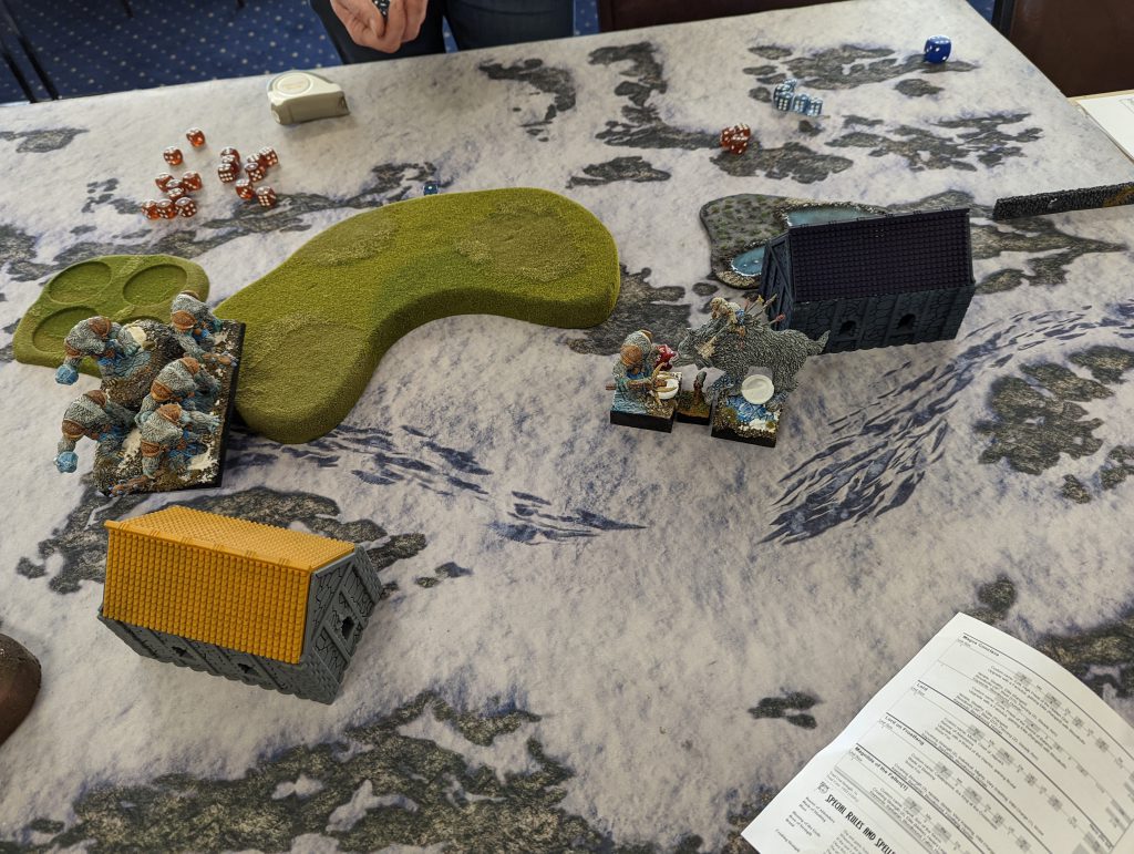 There were a couple of key moments in this game, the most obvious in the Mortars finally missing at the end there. But a sleep deprived Rob moving up his Decimators and losing them without firing a shot was a big one too. The double one’s on the Halfbreeds didn’t end up hurting too much because Rob’s lot of rolls following were so bad. I thought the Frostfang Lord should have been able to take two turns to get through at least, but dice are dice and I won’t complain given what I’ve just written.