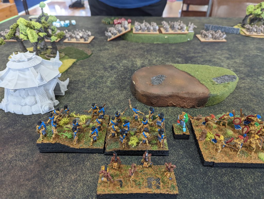 The middle of the battlefield has a forest; a big forest. It’s actually very irritating how big this forest is because I have very little avenue with which I can make use of my war engines. Either side of this forest, with a decent 6-12” gap, is a piece of blocking terrain. It is between these two pieces of blocking terrain that sit either side of the battlefield that my army must pass, and there’s a cursed forest in the way.