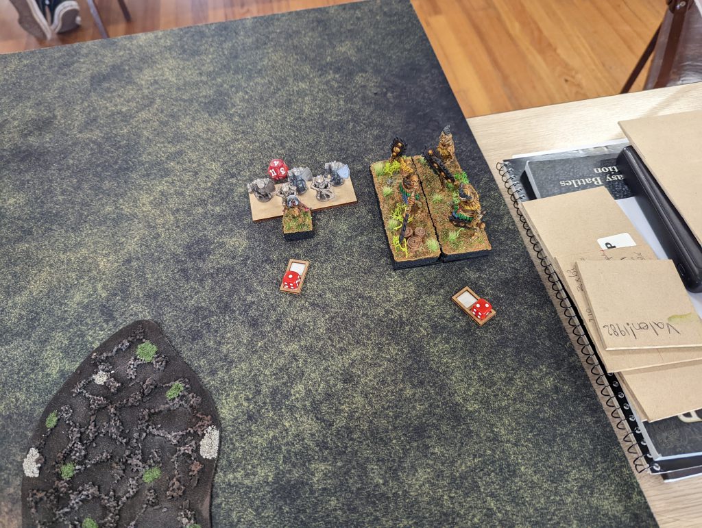Rob gets first turn, and trundles forward, with everything but the Mortars. He blocks his line of sight to the Huscarls with his Golems, so shoots the Draugr, rolls hot on the nerve (twice mind you) and promptly kills them. So that gives me a bit of pause, but there’s not much that can be done, just have to keep the good units out of sight from those mortars.