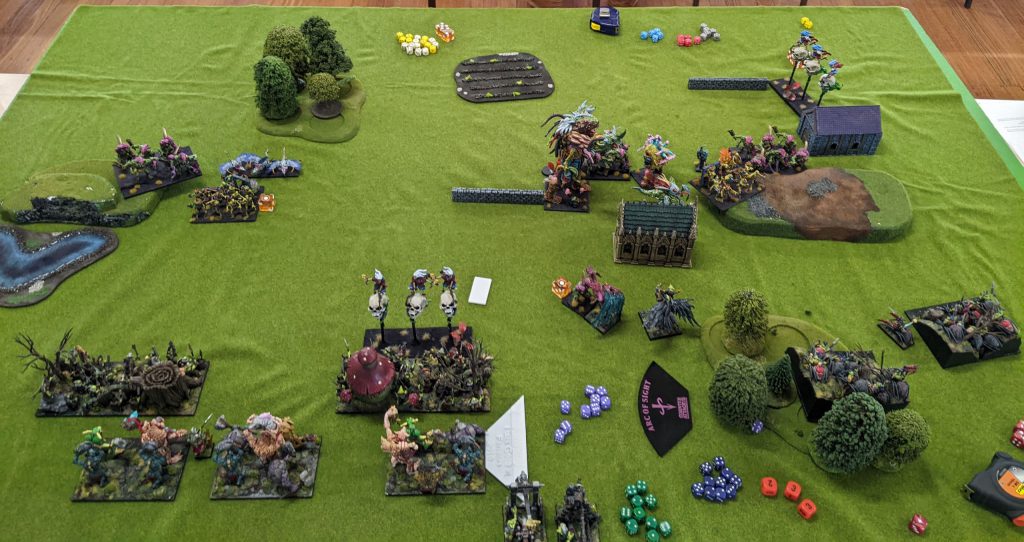My last game on Day One was against Rob’s Abyssal Dwarfs. I don’t have a lot of familiarity with the Abyssal Dwarfs, having only played them once before, but this looks like a pretty solid list. Lots of high defence, ranged support, the right amount of chaff and some nasty shooting. Fortunately, Invade gives me a bit of a chance, again, the small legs of the Dwarfs give me an advantage, and I’ll want to be heading towards him to minimise the effectiveness of those Mortars.