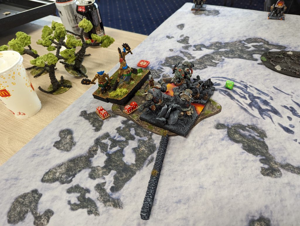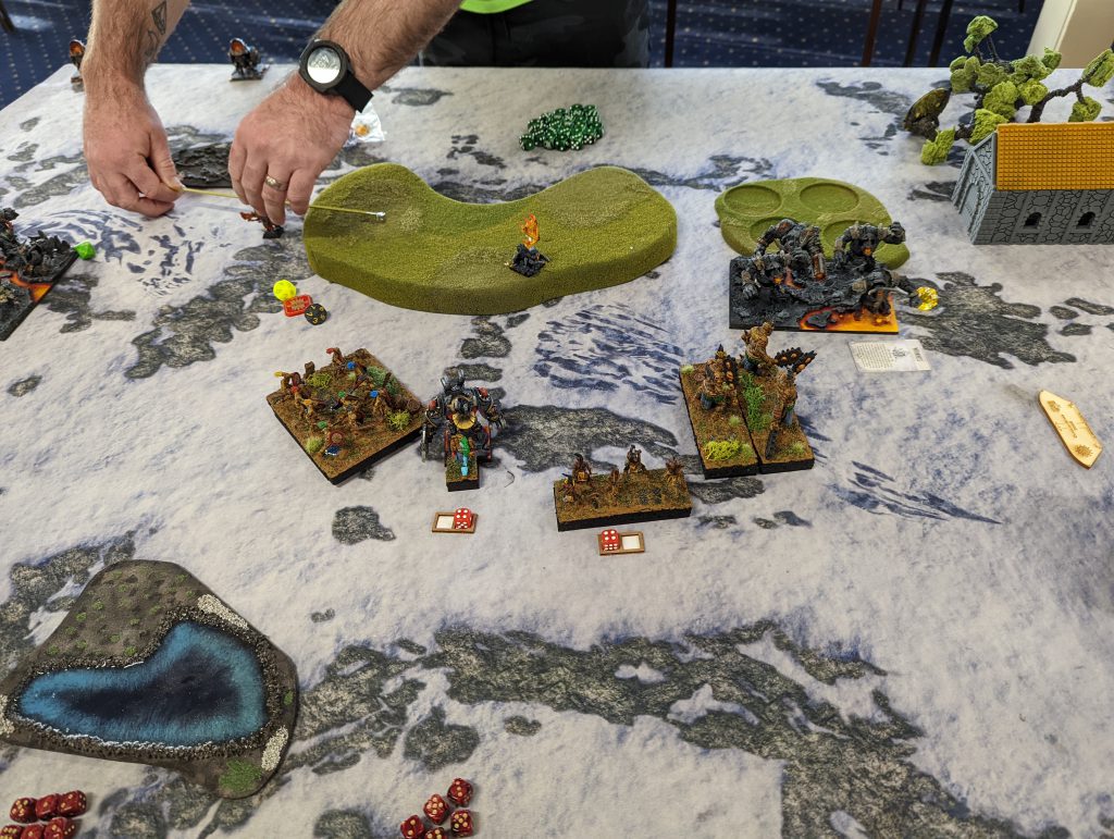 I hit back in the middle. The Lord on Frostfang goes into the Golems for a few wounds. The Foot Lord goes into the Infernox, but fails to do any damage. Rob wasn’t thinking and ran his Decimators forward, and put them in charge range of the Huscarls, who did a lot of damage and wavered them. In fairness to Rob, playing four games a day is tiring enough, AND they had driven through the night to get to the tournament in time, so I’m sure that wouldn’t have happened in any of the other games. The Fallen and Reavers charge the Halfbreed, with the Fallen in the flank they are devastated, but I double one’s them, so they stick around. On the left, the Foxes chaff up the Golems, and the Fallen start working on Infernok.
