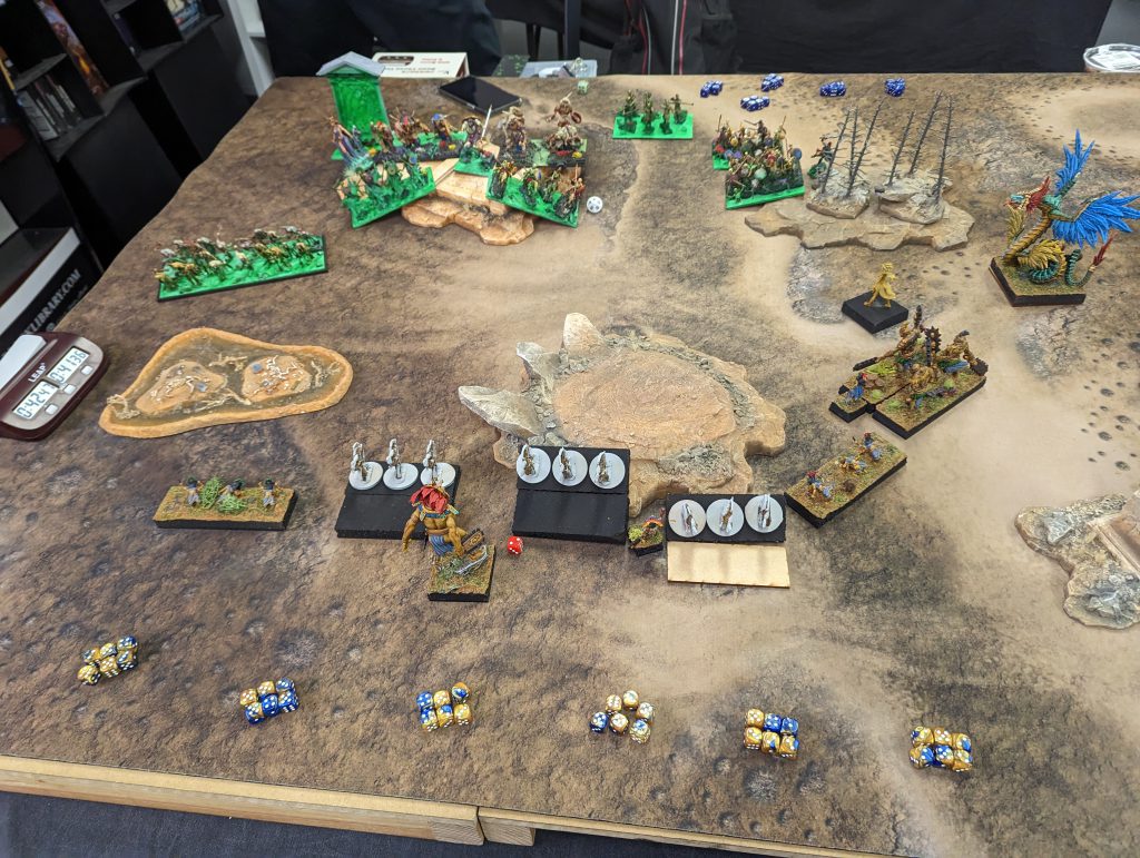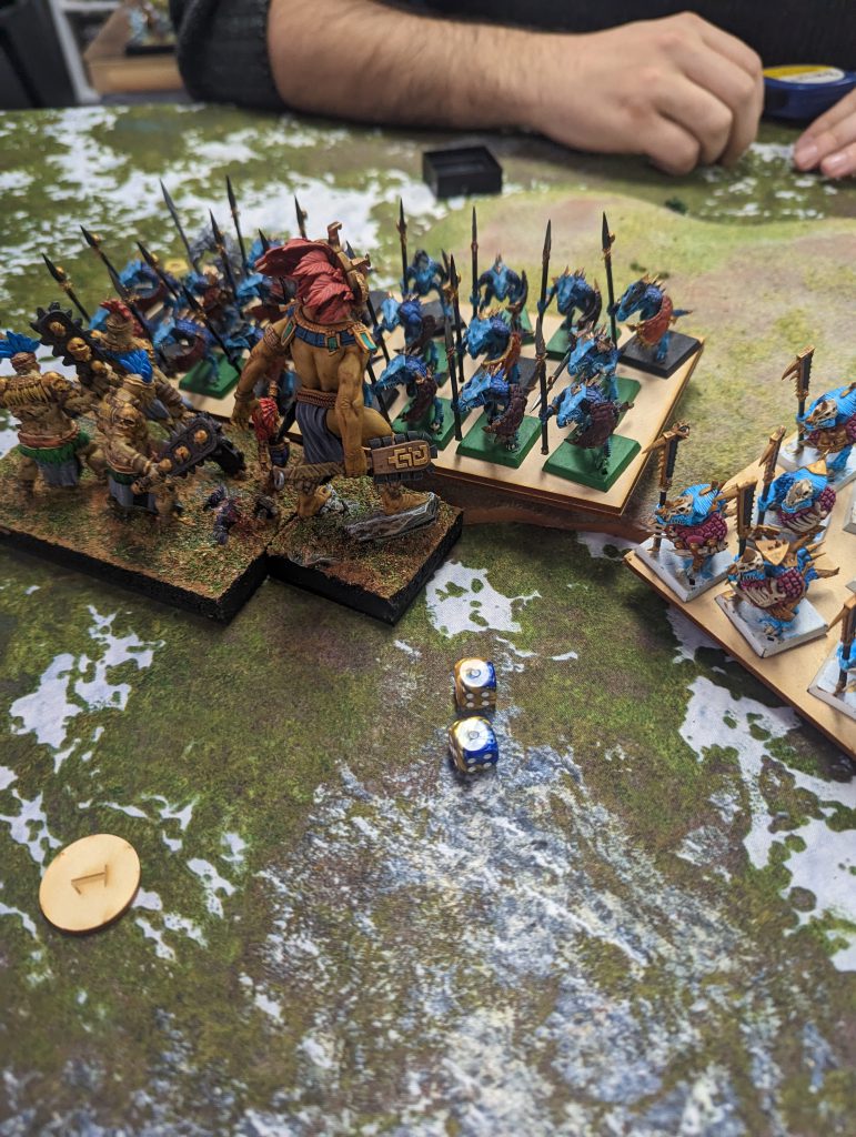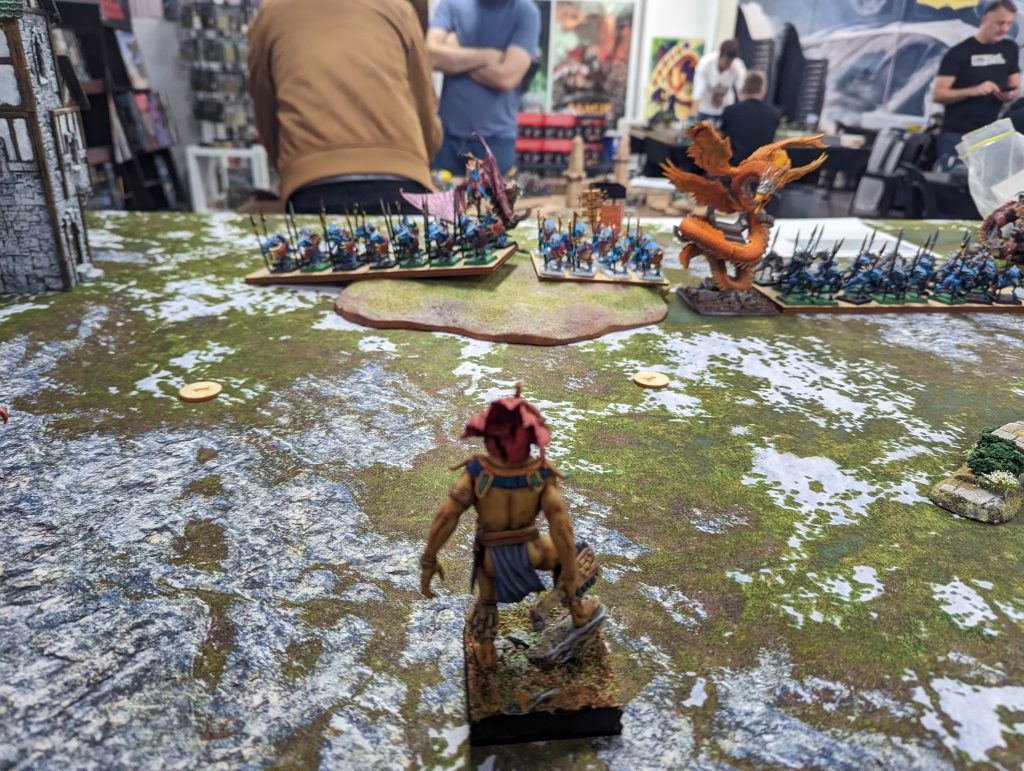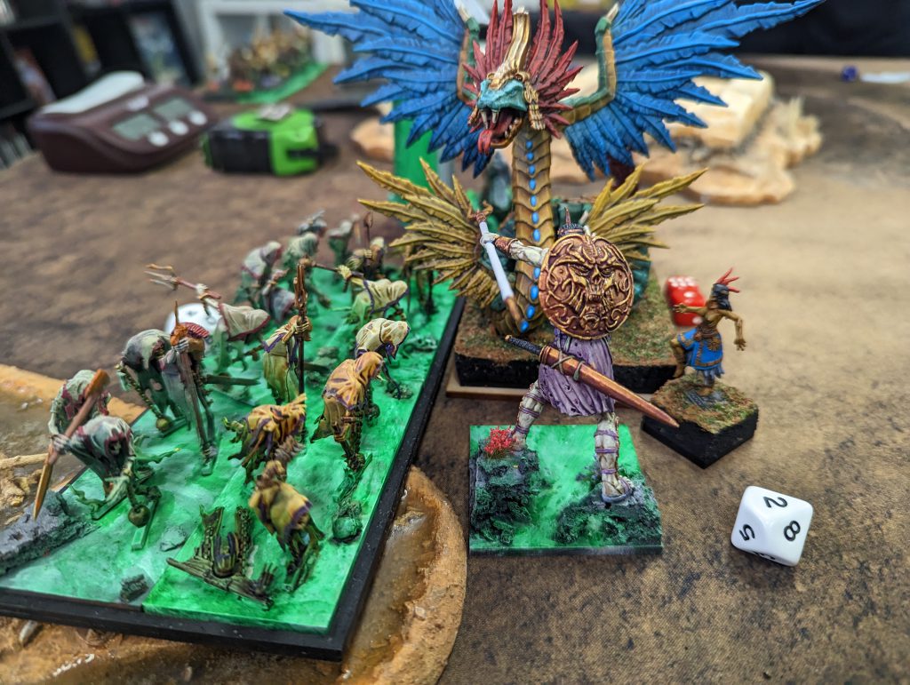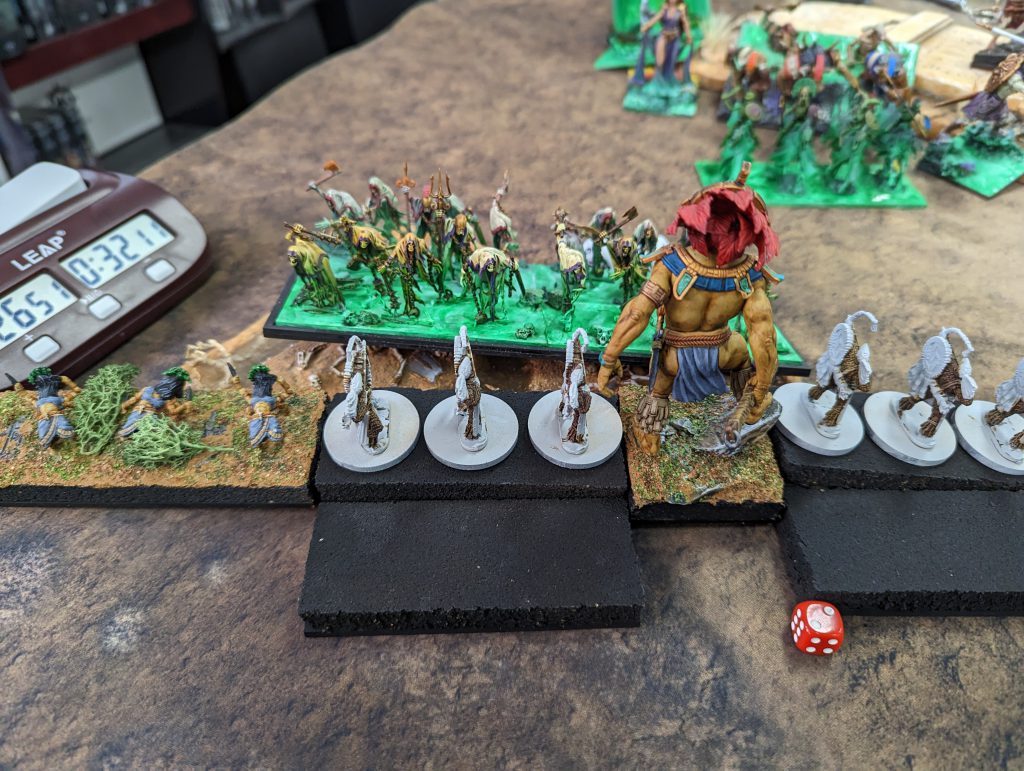 This is a tough list. It's got big blocks of high defense infantry backed up by a lot of heal. A bit of shooting to keep you honest, a hefty bit of punch and it's fast too. Annoyingly, it's faster than me, and while the Scorchwing Regiments will struggle to kill most of my units in one go, they will hold them up long enough for the other unit to get into a flank, or to get the Rhinosaur Cavalry or Rakawas in charge range.