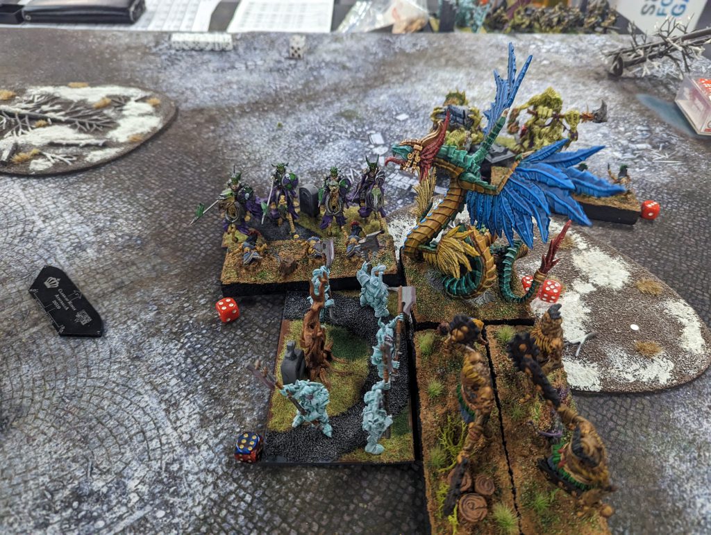 At this point my brain was struggling, a new army at a tournament was draining. My Dragon still lived, and I saw a path to reach the nearest, yet distant token. What I somehow managed to completely avoid seeing was that Dave’s Soul Reaver Infantry were clearly in range to charge, and he did so. Sorry Dragon.