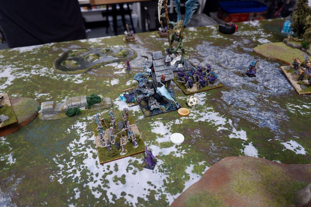 The other Fallen try to stop the next Wights, but can’t manage it, and are also taken off. On the other side of the board, the shooting from the Night Raiders is doing nothing, and the Cavern Dweller can’t roll enough attacks to kill the Wraiths. We do do some damage, killing the Soul Reavers after a lucky waver, and Chimera bounces around taking out some Revenant Cavalry before running off to claim an objective for me. In the end, it is one to three, to Andrew.