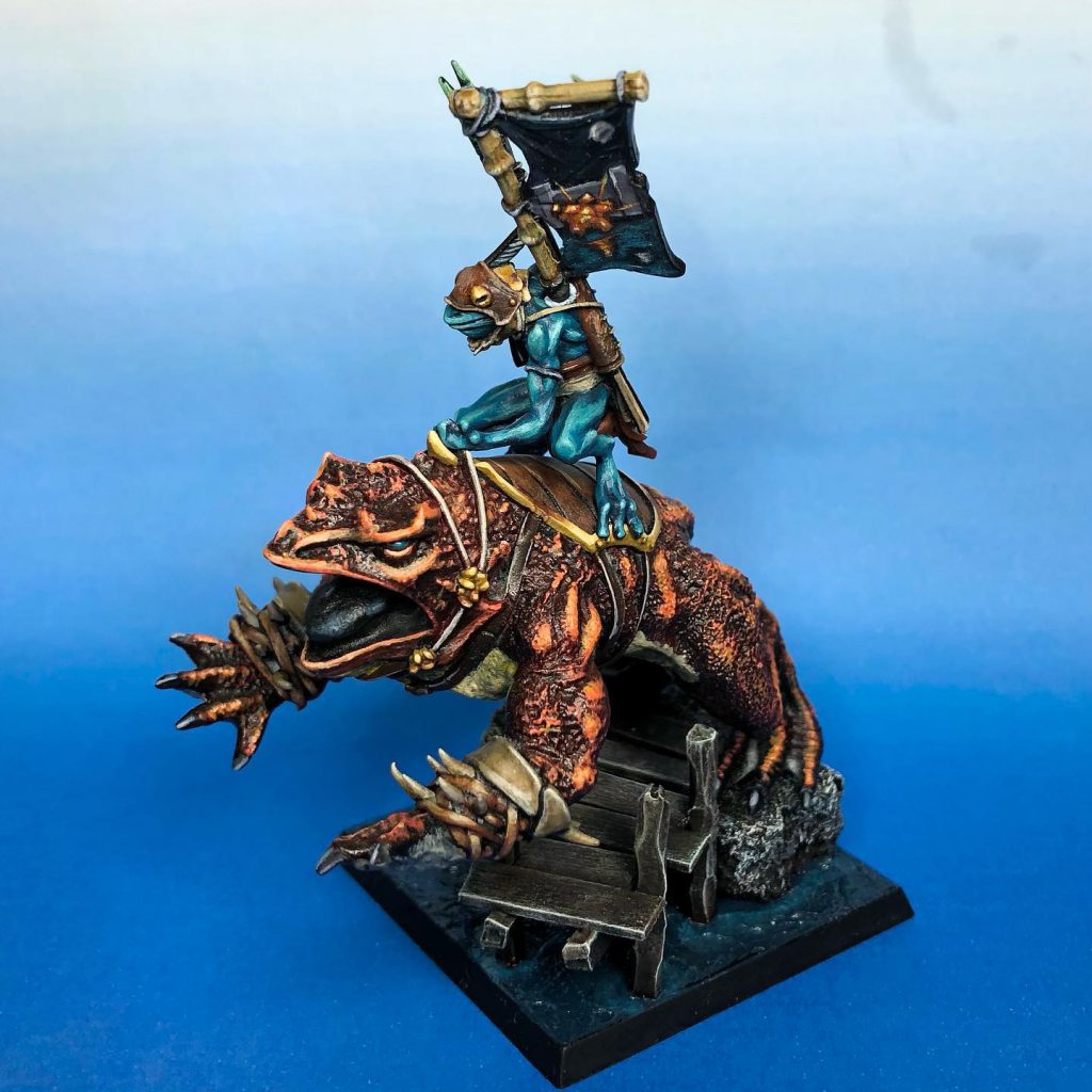 Firstly, it has Aura (Vicious - Amphibian only) which makes this frog-chief an auto-include in any frog army. Even if you have one horde of RiverguardDambusters, the Sentinel is worth taking just to make sure they get the job done. Secondly, the Sentinel is Inspiring, so it has a purpose following the army. Finally, it has Fly and Speed 7, so it can hop anywhere it needs to be, and keep up with your froggy forces.