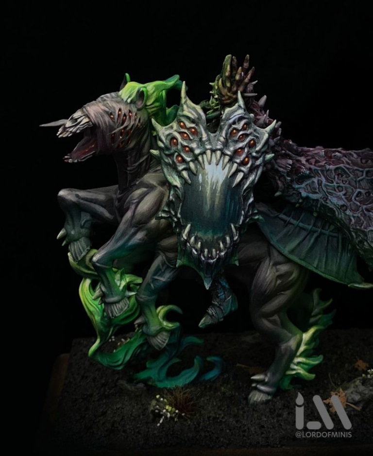 The standard wizard of the Twilight Kin, currently the only available model is mounted on what appears to be a slightly smaller Nightmare. Hopefully a model on foot becomes available, perhaps through the Mantic Vault. Like the Navigator and Mikayel, she has the flesh-like cloak, but her mutations don’t stop there. Her right hand (her spellcastin’ hand) has melted into some kind of fleshy hand-cannon from which her channelled magic now erupts. Thankfully she still retains her left hand for holding daggers and using her smartphone.