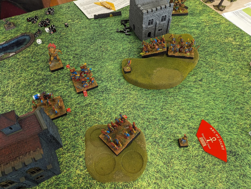 Then the tokens flipped. The leftmost Sisterhood Scouts have a 2 Victory Point token, the Ogre Palace Guard in the forest have the other one. Amidst my forces, I have two 1 Victory Point tokens. Not good.