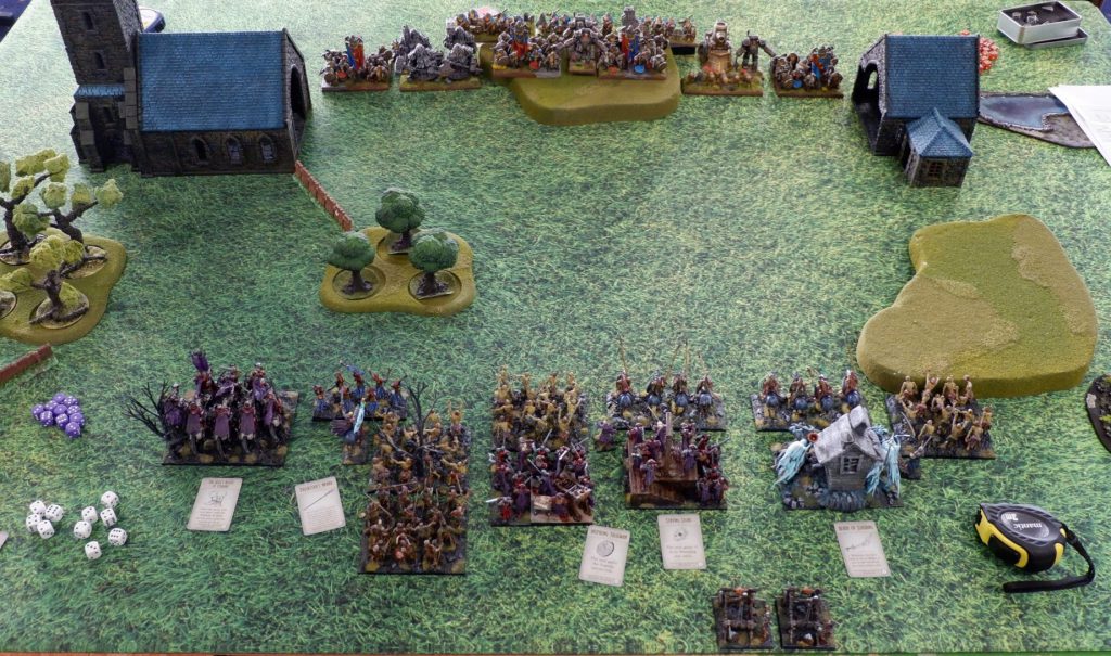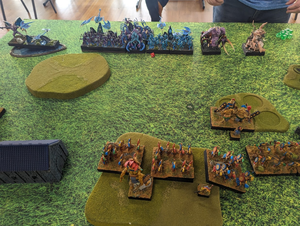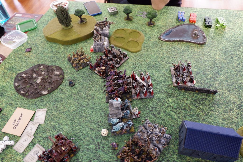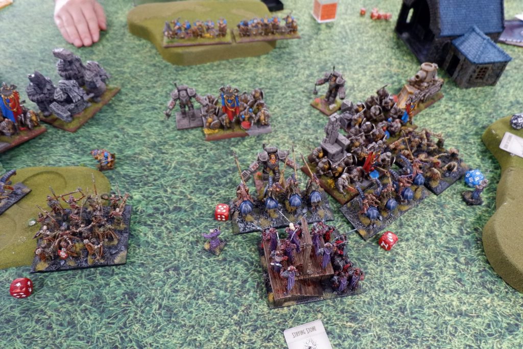 After my intense game with Scott, I couldn’t think of a good plan for this match. The two pieces of blocking terrain and the surrounding difficult terrain made it difficult to think of a plan to flank the Dwarfs. Unfortunately, flanking Dwarfs was exactly what I needed to be doing. I arrayed my entire army in the centre, and grimly prepared to press on.