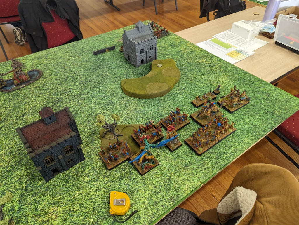 Vivien formed a battle line that spanned his deployment zone. On the left, a Phoenix sat with the Men-at-arms Spearmen horde with Sisterhood Scouts behind. A regiment of Elohi are behind the leftmost building. In the middle Gnaeus with Ogre Palace Guard horde and the other Phoenix and War Wizard. Behind the forest on the right are the other Ogre Palace Guard, the horde of Elohi, Sisterhood Scouts behind. In the far right lurk the other regiment of Elohi.
