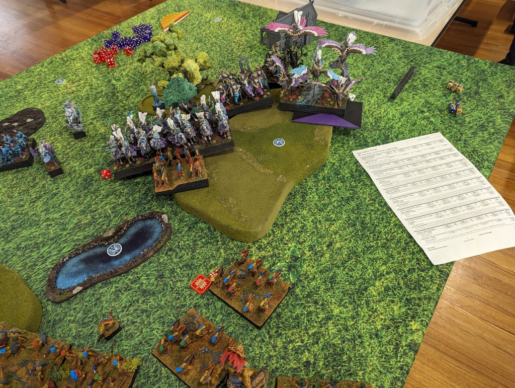 The demise of the Soul Reaver Cavalry left the Ogre Palace Guard completely exposed to the Wights. The Phoenix failed to disorder them, so the Wights went into the flank of the Ogres (with a withdraw) and the Wraiths finally brought down the Elohi regiment. The Men-at-arms Spearmen attempted to punish the Wights, but with their failure went down to a combined Wight and Soul Reaver Infantry attack. The Elohi horde went into the Wraiths, but also failed against the Defense 6+. These angelic beings were brought low by the other Soul Reaver Infantry. At this point the final regiment of Elohi fell to the Zombies, as did the Phoenix to the Skeleton Spearmen.