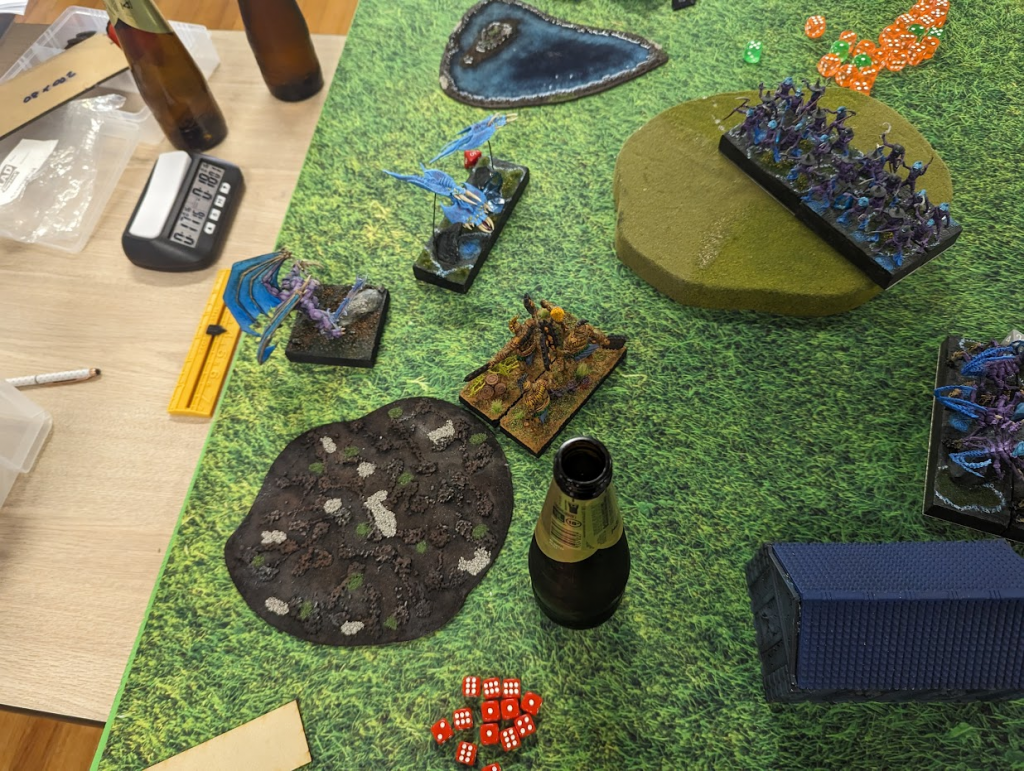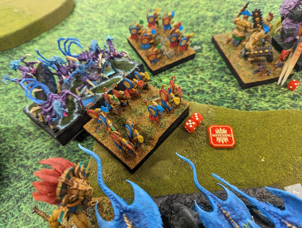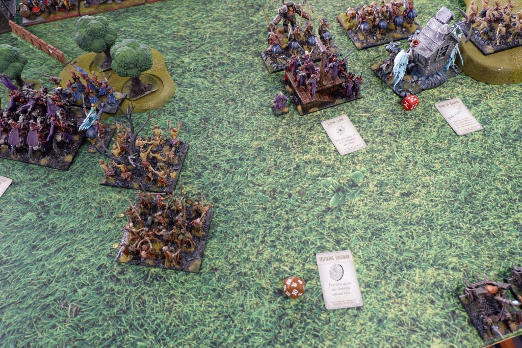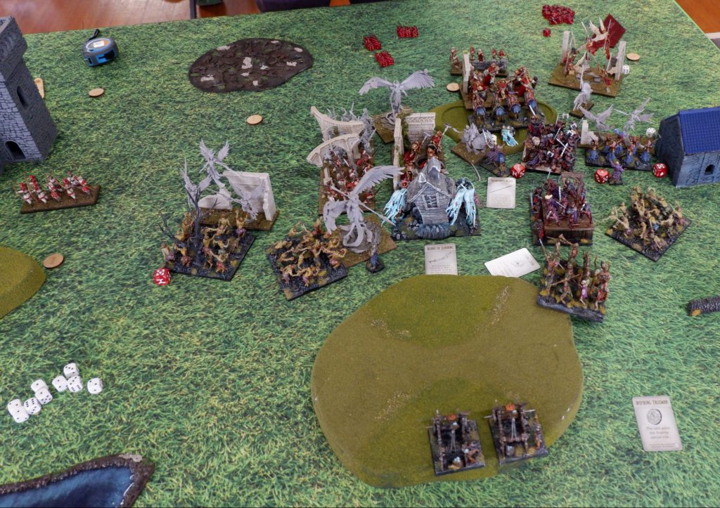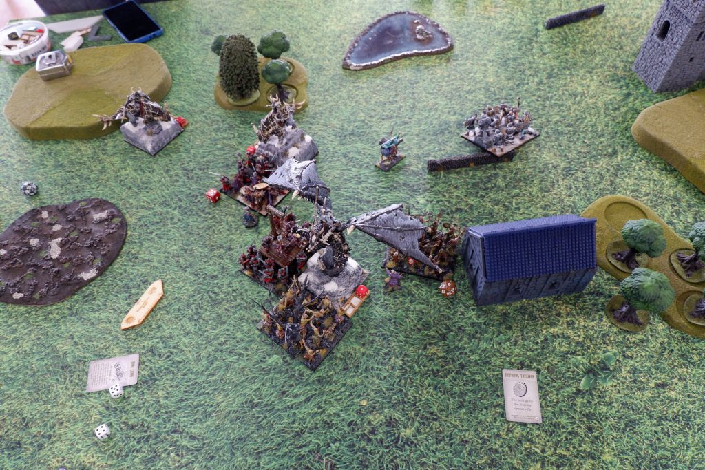 What remained for Scott were the two Burrowing Wyrms and the Flying Wyrm, a regiment of Soul Reaver Infantry, some Ghouls coming from the far right flank and some lonely Zombie Trolls. Token distribution was one on my Soul Reaver Infantry, one on the Trolls, and one in the middle to which the Ghouls were intent on grabbing.