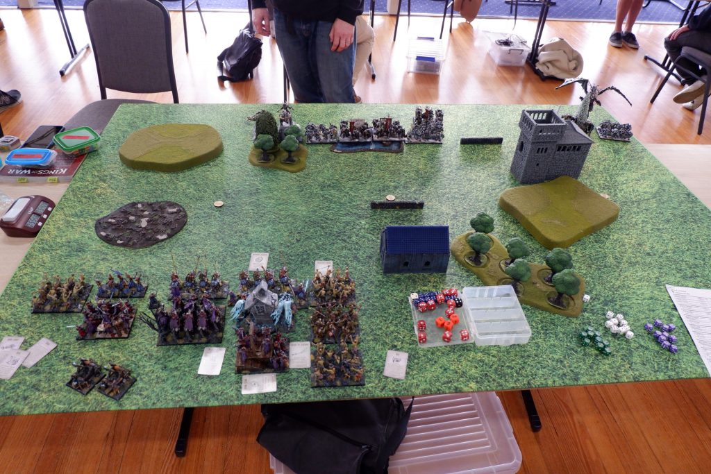 At this point the game is coming to an end, and is very close. Units and tokens are constantly being swapped, but the Knight Horde is the real power here. It is big enough to pivot and claim both a two and one point token, and I have no unit strength left to contest. So I abandon the one point there and have the Chimera and Magnilde join the combat on the right flank. She and the Troll take out the Centaurs, after they take out the Foxes. The Troll gets the overrun needed to land on a token, and Magnilde and the Chimera will almost certainly take out the Centaur Troop, and they do. Unfortunately, it is not enough. While the battle has been developing on the right side, the left is another matter. The Unicorns have just been hunting the Fallen with their Lightning Bolt. It was looking up as one failed to hit or wound completely, but the other one manages to get the wound, and with a large nerve roll, I lose my two point token, giving Tucky a 3-2 win.