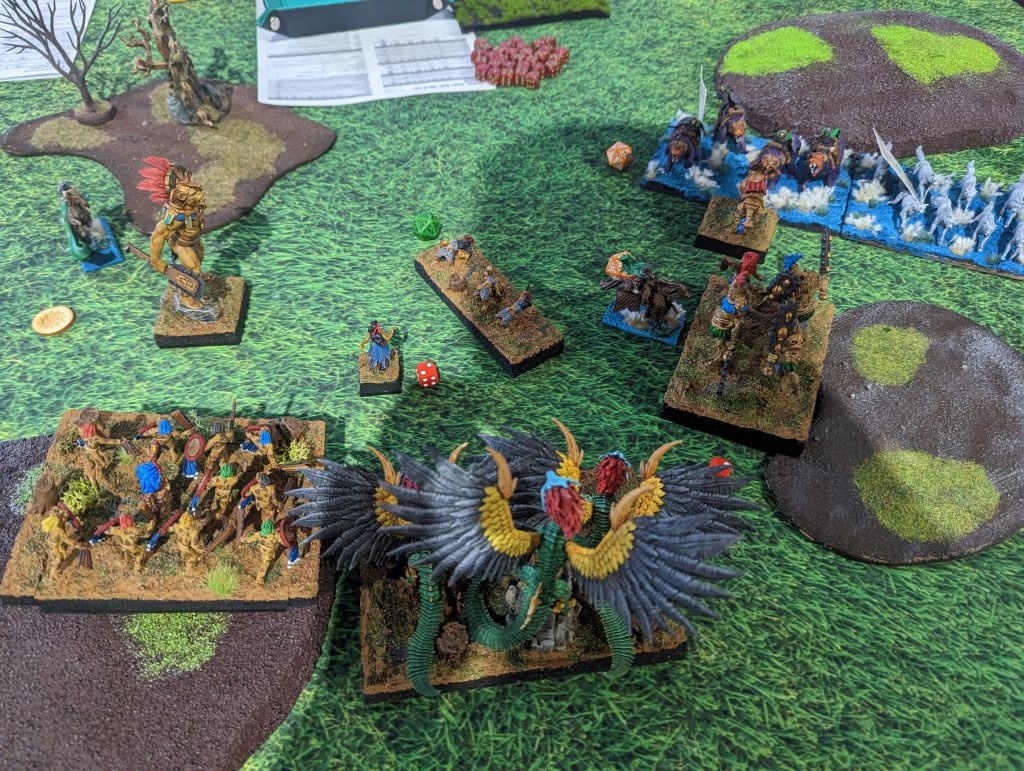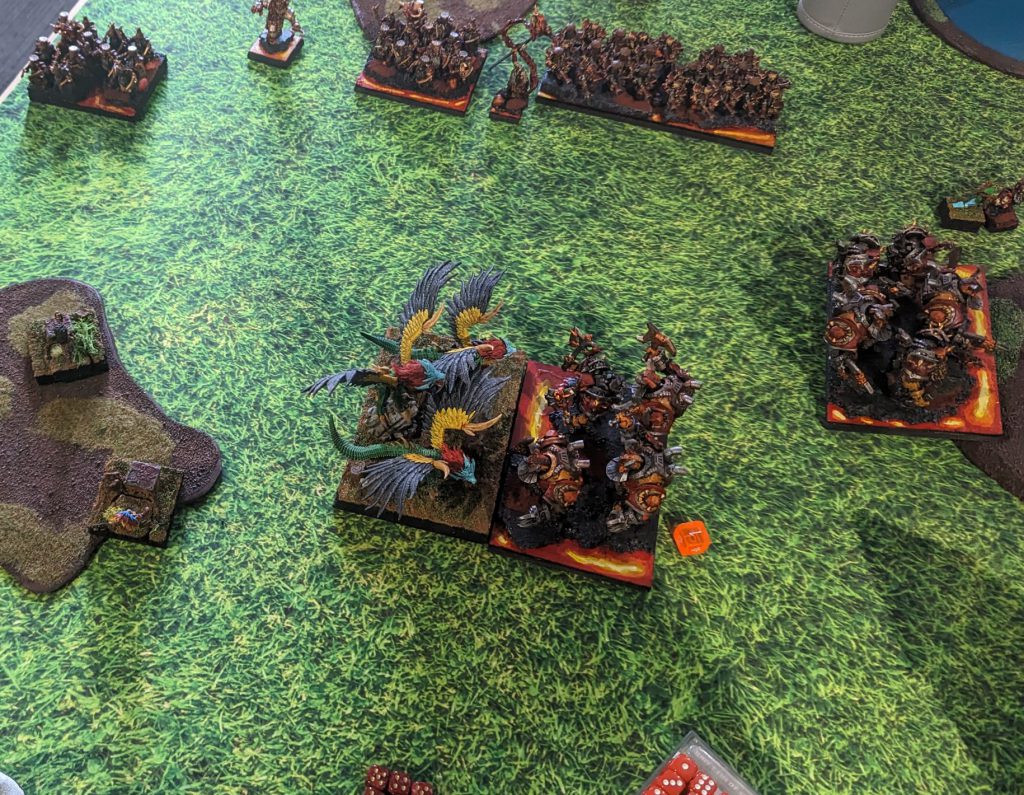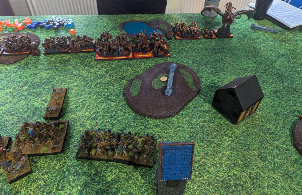Going into Turn 6, the Snow Foxes are untouchable, so that gives me two points, but the Fallen are in danger. They moved onto a one point token, so were holding two points worth. The Lord on Frostfang charged the Lesser Obsidian Golems on the hill, holding them up. The Thegn charged Dravak, needing one wound to stop his Fireball, and failed miserably. Dravak unleashed his Fireball on the Fallen… and he takes them off… But the Lord is Very Inspiring! That forced a re-roll, and they live! Though wavered. The Lord on Frostfang also was wavered by the Lesser Obsidian Golems.