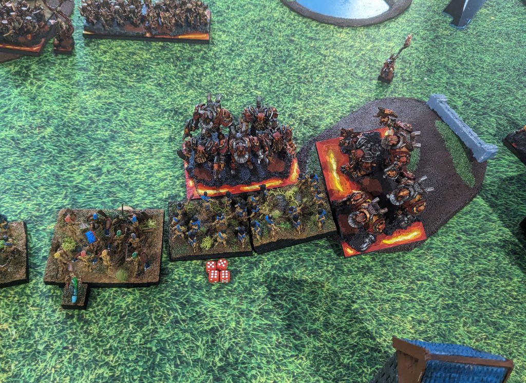 Unfortunately, I moved a bit too carelessly with the Draugr Horde. Lesser Obsidian Golems were surge’d into the front and flank, absolutely crushing the Draugr. The Overmaster also managed to squish Magnilde in one round, which was particularly annoying. To add insult to injury, Kruufnir was blasted off by the Fire-Oil-enhanced Decimators, but that was not surprising at all.