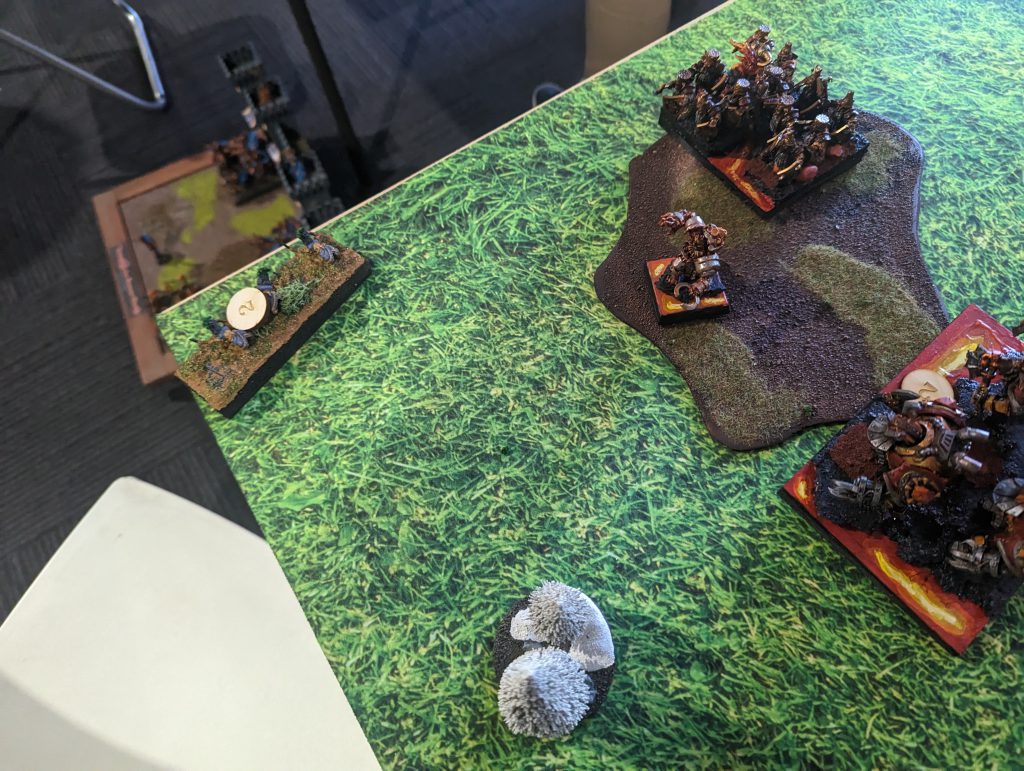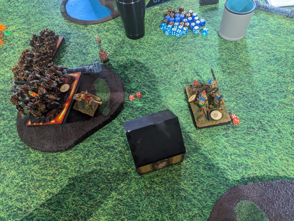 What a game! A very tight game that could have gone either way, right down to the last die roll. That is exactly how a great game goes. Ooh, that turned out to be a rough list, and a few different dice rolls could have swung the game at any point. Of course, all varieties of Dwarfs do suffer in scenario play, but he did get a big attrition swing against me! I am left with only 3 units on the field, but two of them are the token holders.