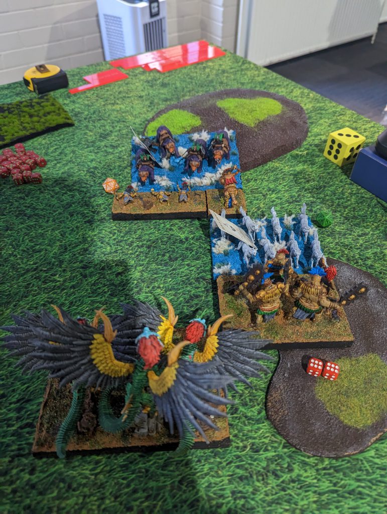 The Huscarls killed the Jabberwock, a triple charge of Magnilde in the front with Kruufnir and Snow Foxes in the flank took off one of Ozzy’s Frostfang Cavalry hordes. The Fallen wavered one of his Lords and my Lord on Frostfang managed to waver his remaining Frostfang Cavalry horde.