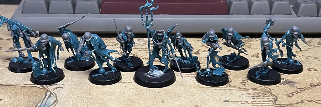 Age of Sigmar's Nighthaunt range is an easy pick for the ghost-bits. They're great looking models, scale perfectly with "real" Trench Crusade minis, and sprues can be very easy to find on the cheap. Chainrasps, especially, is a unit that Nighthaunt players have historically been inundated with; they've been in starter sets and Hachette partwork's magazine. I won't tell you how to buy them but have a look around and I'm sure you'll find a cheap sprue somewhere.